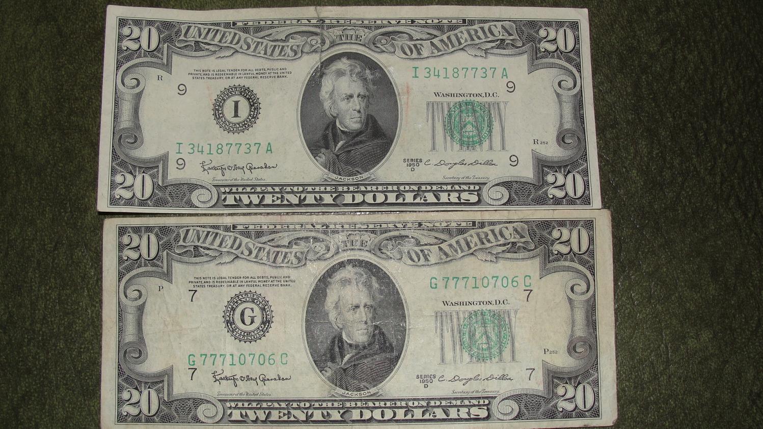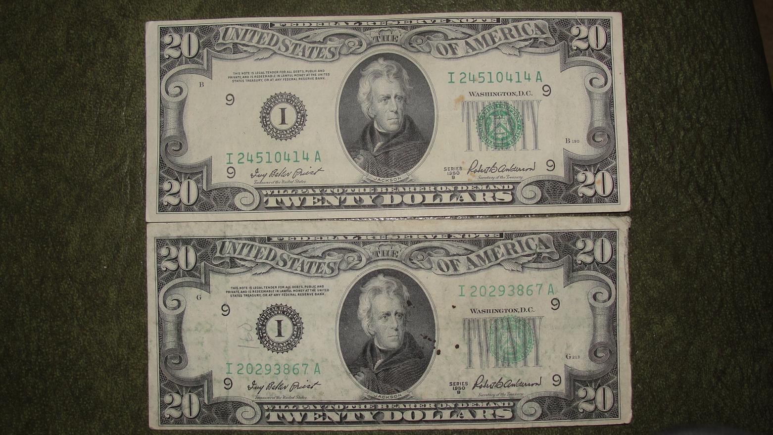 Here are a really nice series 1969 and (2) series 1950D $20 notes. Please note the lower note of the two 1950D series has four 7's in the S# as well as the four more in the corners