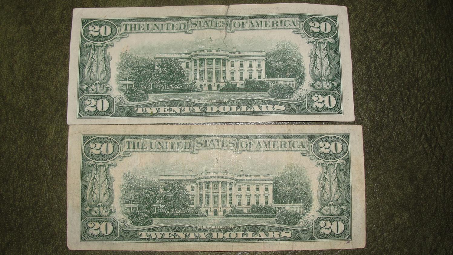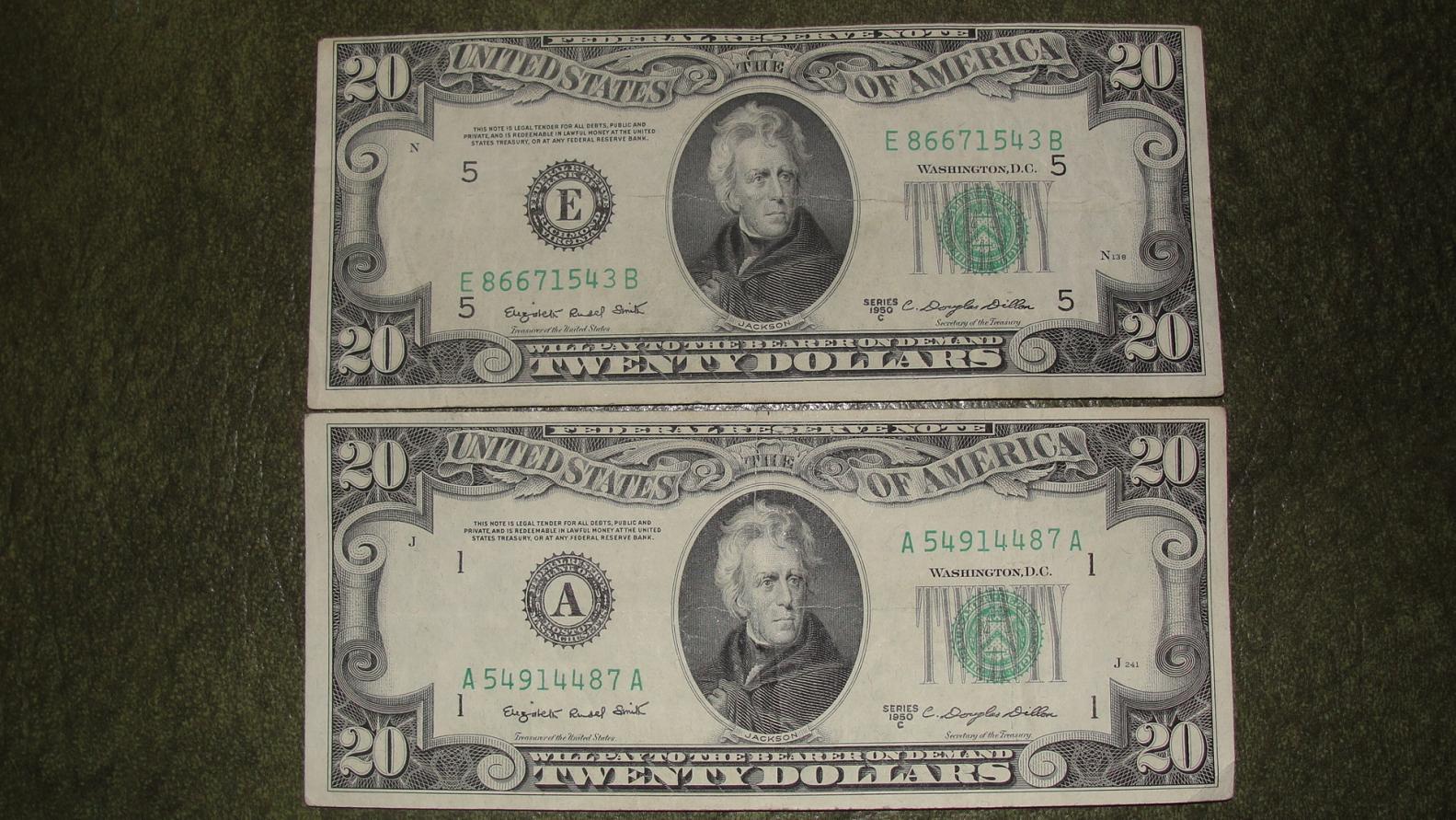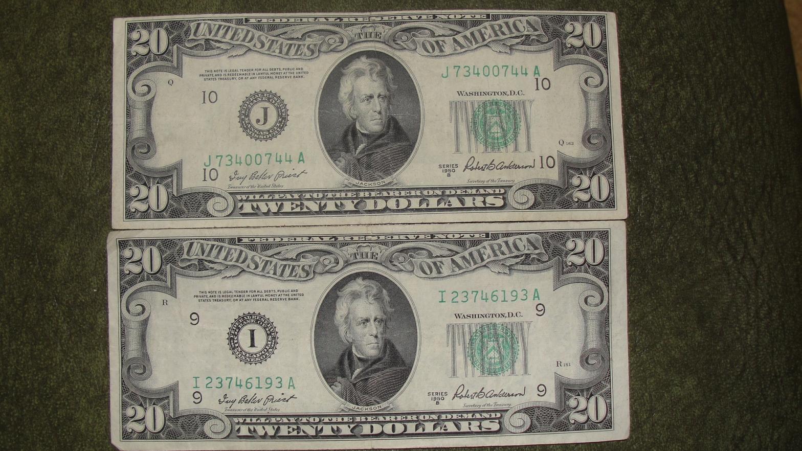 Here are two nicer series 1950B notes. The top one is another minor offset printing, and look at that S#! So close! Followed by a series 1950 note.