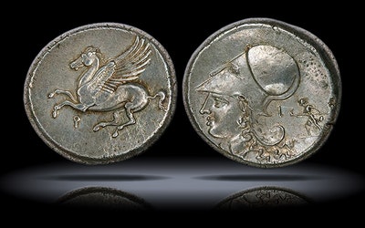 My SteveX6's: RR M Volteius Mf AR Denarius 78 BCE 18mm 3.96g Hd Hercules R lion skin headdress - Erymanthian boar Cr 385-2 ex SteveX6 RPrv Trajan AE Dichalkon Laureate hd L Rhinoceros walking L LI-Z yr 17 CE 113-114 12.9mm 1.25g Emmet 719 var. rhino right RR Hd Juno Sospita R goat skin hddrss She-wolf R placing stick on fire eagle stndng fanning flames 45 BCE 19.0mm 4.07g Cr 472-1 Troas Kebren AR Obol Archaic hd Apollo L - Hd Ram in Incuse sq 5th C BCE 7.65mm 0.64g SNG Ash 1086 Makedon Philip II AE 18 Apollo - Youth Horseback spear hd below 359-356 BCE RIGHT-RIGHT 18mm 6.2g SNG ANS 850-1