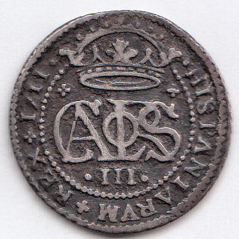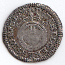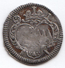 The pretender coins were struck at Barcelona from 1707-1714. The catalog value is $65.00 in VF. The 1/24 Thaler is the AL variety, so the mintmaster’s(?) initials are AL. It catalogues for $12.00 in VG.