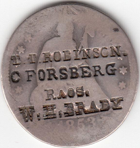 Another of Steve Hayden's token auctions (#33) just closed on December 11th, and prices for counterstamps and other material seemed pretty strong. I bid on 7 lots and actually won 6 of them, very good results for me. I got a 7th one when the consignor decided to put a fixed price on a lot that didn't sell. The average price realized for 20 lots was about $231.00, up a good amount from the last auction in September. I think the material offered was a little better this time, and included a few pieces from Dave Bower's collection. Surprisingly, a counterstamp on a 1907-D $5 gold didn't sell. It had a suggested bid range of $750-$1000, but received a high bid of only $500 I think, so it was rejected. Generally counterstamps on gold coins sell easily and for good money because of their rarity. This one though (T.R. Berry) was unlisted, and weakly struck, so not very appealing. So far I've only received one lot in the mail, but I'll post a pic of it. This one is particulary interesting because it has multiple names struck on it. "C.(harles Forsberg" was a New York medical instrument manufacturer in the 1850's. He issued his own counterstamps also, but only 2 or 3 pieces are known all on 1853/1854 S/L Quarters. T.T. Robinson, Raos, and W.H. Brady are unknowns, but may be traceable through old city directories. On these type of multiple strikes it's sometimes the case where a die sinker decided to test his punchs on a coin to check for quality and accuracy. If this is the case here, then these four men may not be related in any way. I have traced a few stamps like this over the years, but never with this many names. Bruce