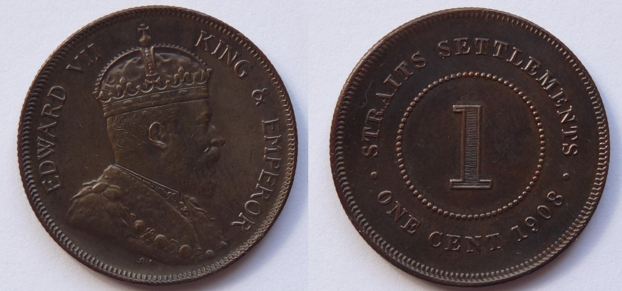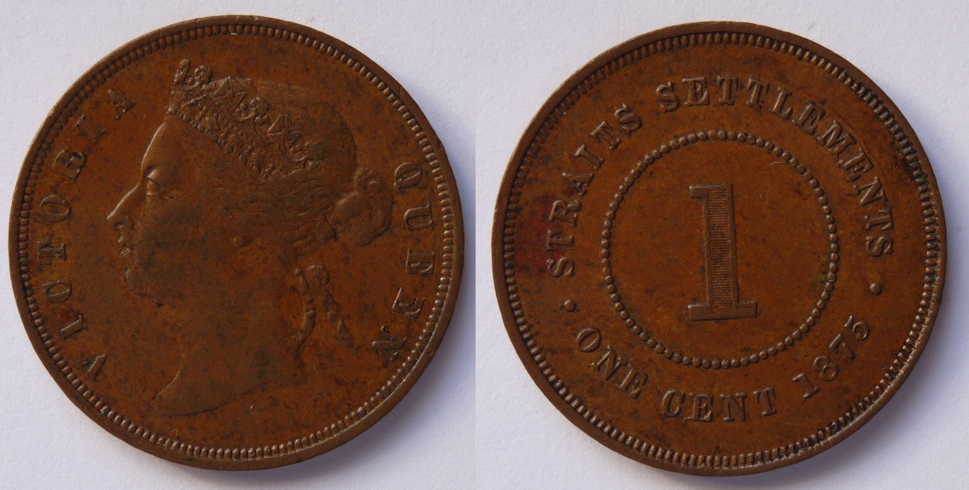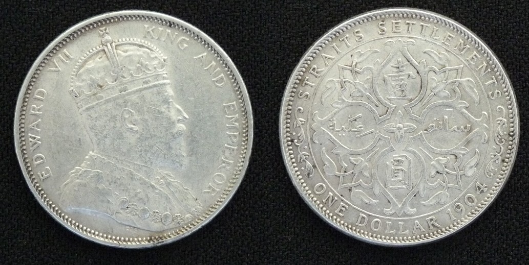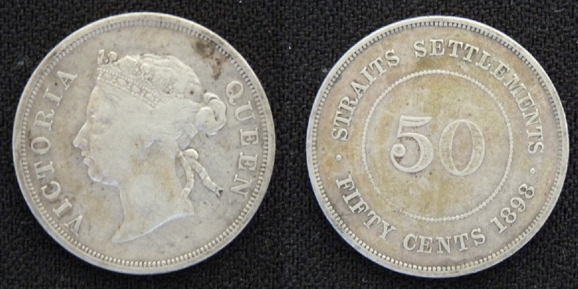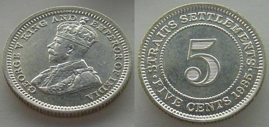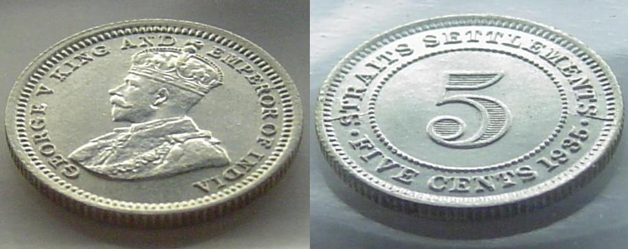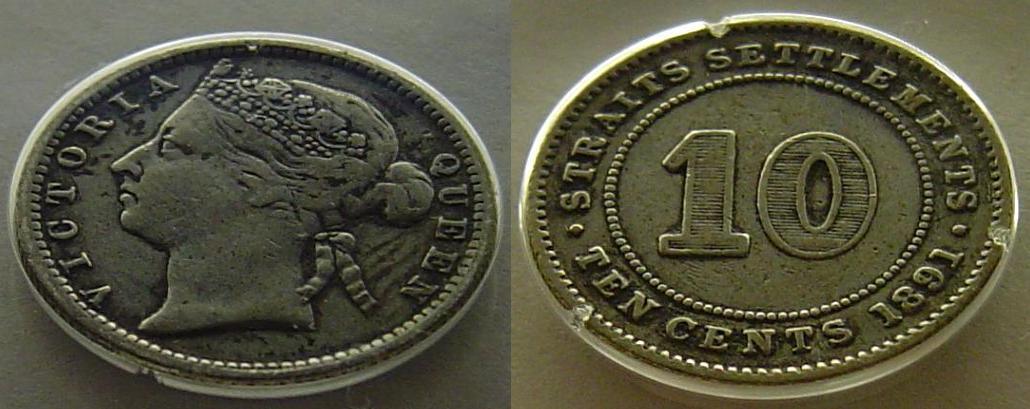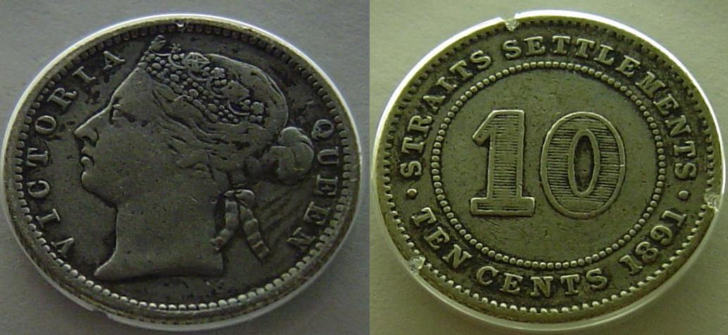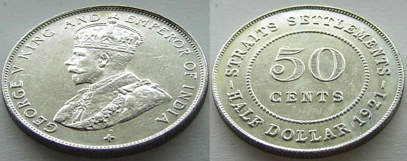 Malaysian coinage - Straits Settlements You are most welcome sir.... yes the Malaysia bronze 1 sen might become a bit collectible, since they are no longer in use.... I forget the last year they struck them, but that would be a good year to have an example of. I always liked the older Malaysian coins, the British Colonial silver coins of 'The Straits Settlements' which was formed in 1826 by combining the territories of Singapore, Penang and Malacca. In 1939 the name was changed to 'Malaya'. On Aug. 31, 1957 'Malaya' was granted full independence, and in 1963 became part of Malaysia. Straits Setttlements coins are quite popular with British Commonwealth coin collectors, they also tend to have fairly low mintages, and the design of the early Silver One Dollar coins is quite beautiful. Here are some photos from my collection of coins of The Straits Settlements: The first pictured is an silver 1891 10 cents of Queen Victoria. The second coin pictures is a little Silver 5 cents from 1935 of King George V, you can see some die cracks on the reverse, this is one of my favorite British Commonwealth coins. Third is a Straits Settlements 1921 silver Half Dollar of King George V.