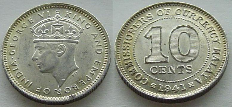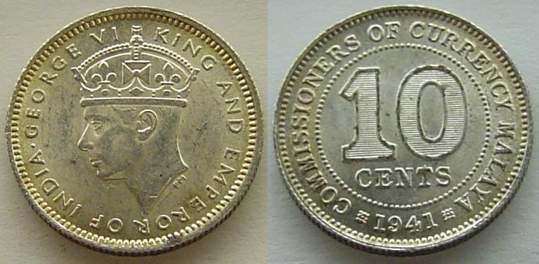 'Malaya' and 'Malaya and British Borneo' First pic here is a damaged 1920 1 cent bronze square coin of the Straits Settlements. Second and third photos are of a coin from Malaya, dated 1941, the year before the Japanese invaded and occupied Malaya and Singapore, 75% silver 10 cents. 'Commissioners of Currency - Malaya' Fourth photo is of a coin of 'Malaya and British Borneo' 1961 K N (King's Norton, Birmingham) ----------------------------------------- Very fun coins to collect, and collecting any world coins is great for learning geography and most importantly history.