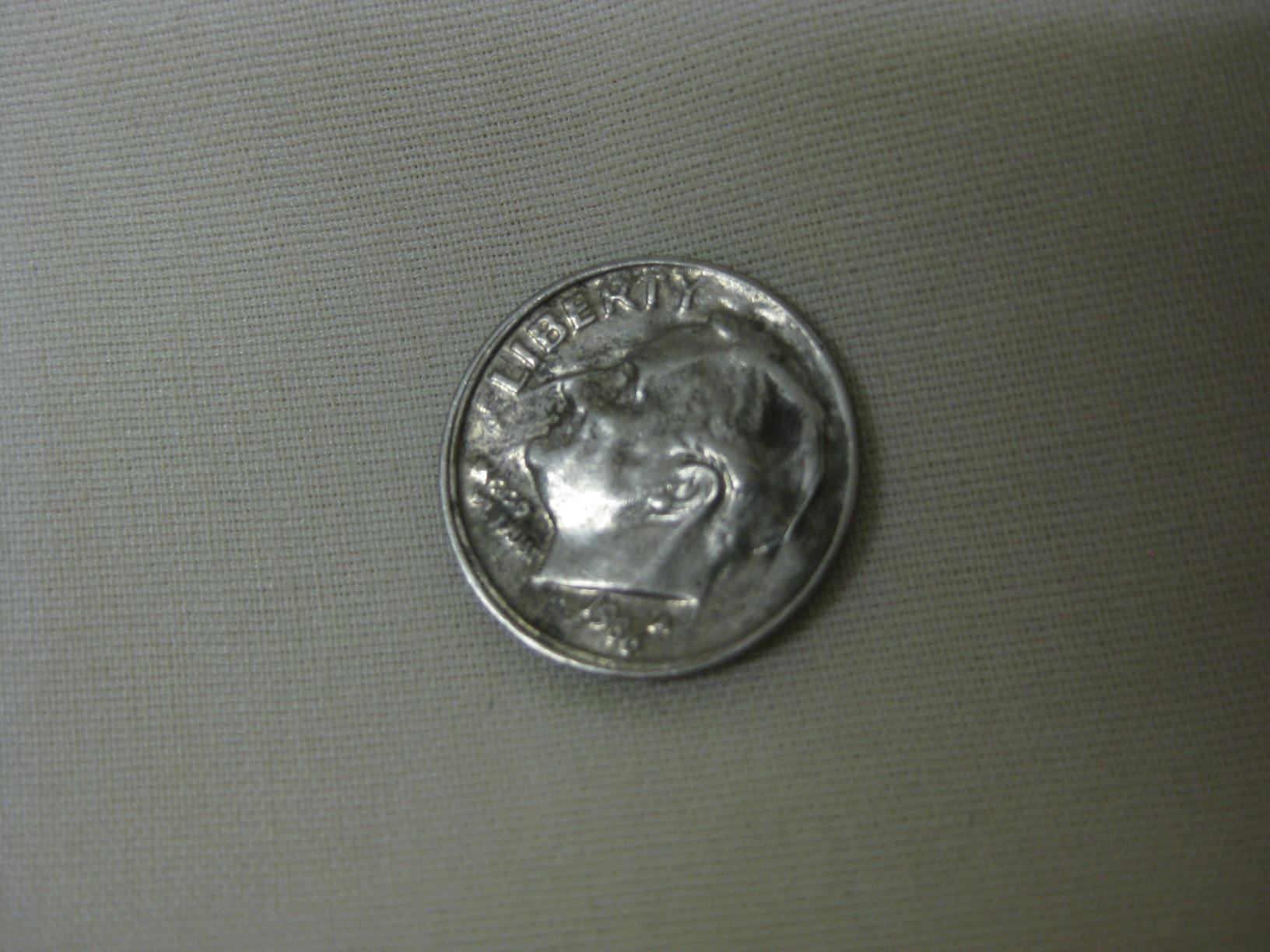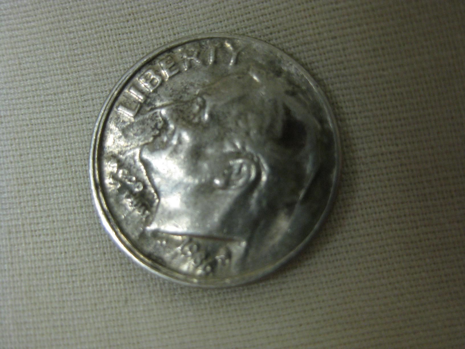 Next up for your inspection is this dime. I have never seen anything quite like this - shown is only the obverse, as the reverse is COMPLETELY clean and normal - nothing interesting at all. But the obverse here is just... wrong. The main lines of the face and neck extend down, and overall it looks like I'd imagine if they'd struck semi-molten metal... lol. If it was fire damage, though, you'd expect SOMETHING on the reverse... and there is nothing. You wouldn't give it a second glance. Not even discolored.