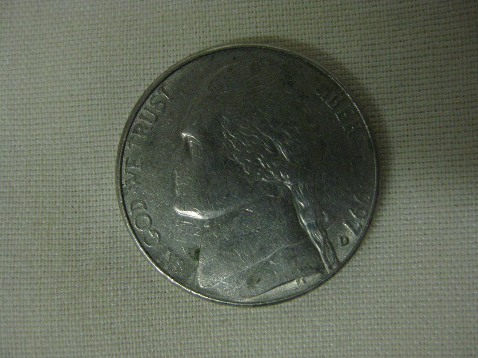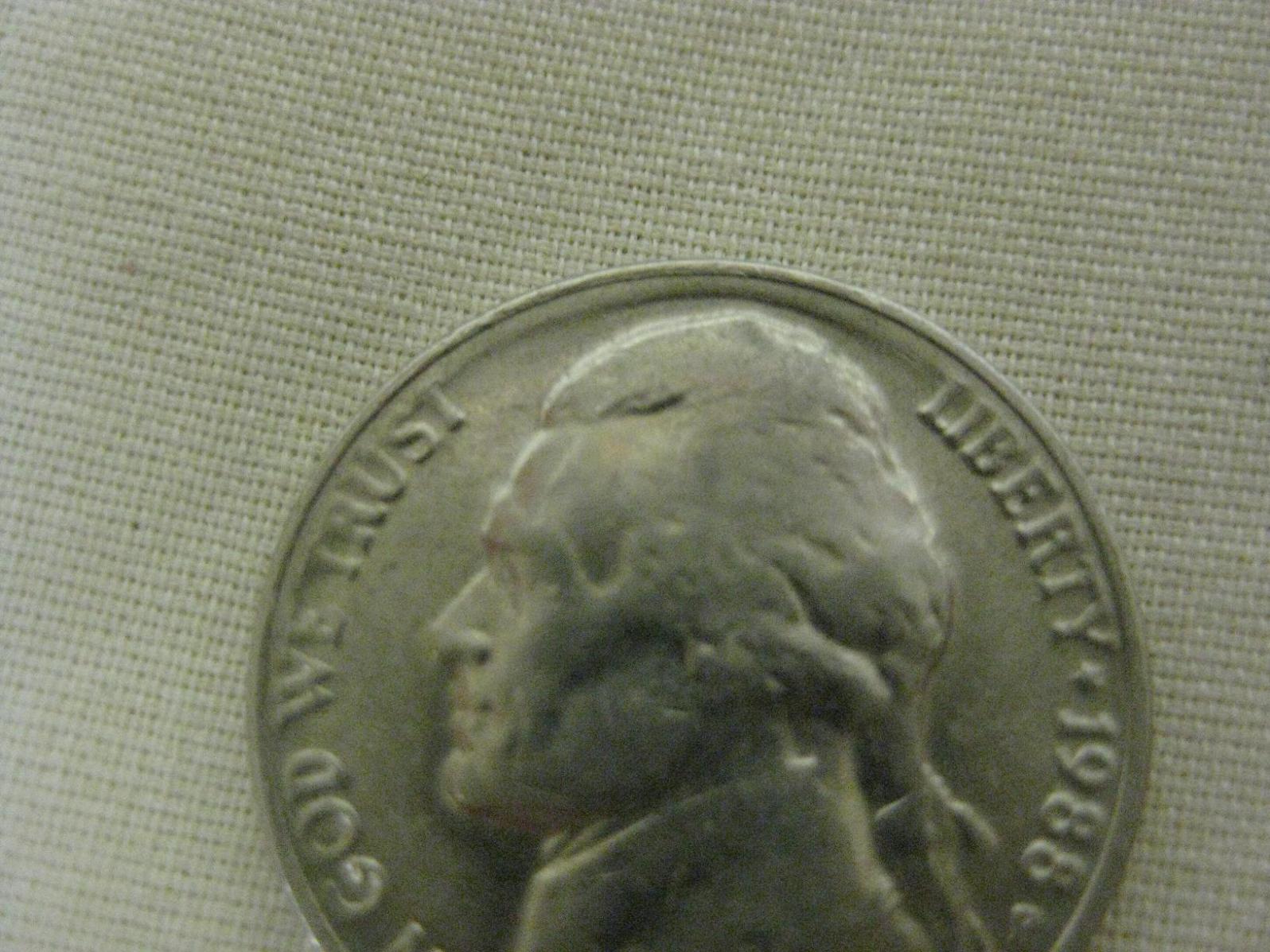 The first Jefferson nickel I would like to show you here, has no motto! Lol. The ENTIRE thing must have been grease-filled or something. If you tilt it JUST right, you can just barely make out a few of the letters in shadow - this picture is showing the letters as clearly as it is possible to see them. The 4 in the date is also faint. This is NOT wear, by the way. CIH, it's very easy to see this coin has little/no wear at all.