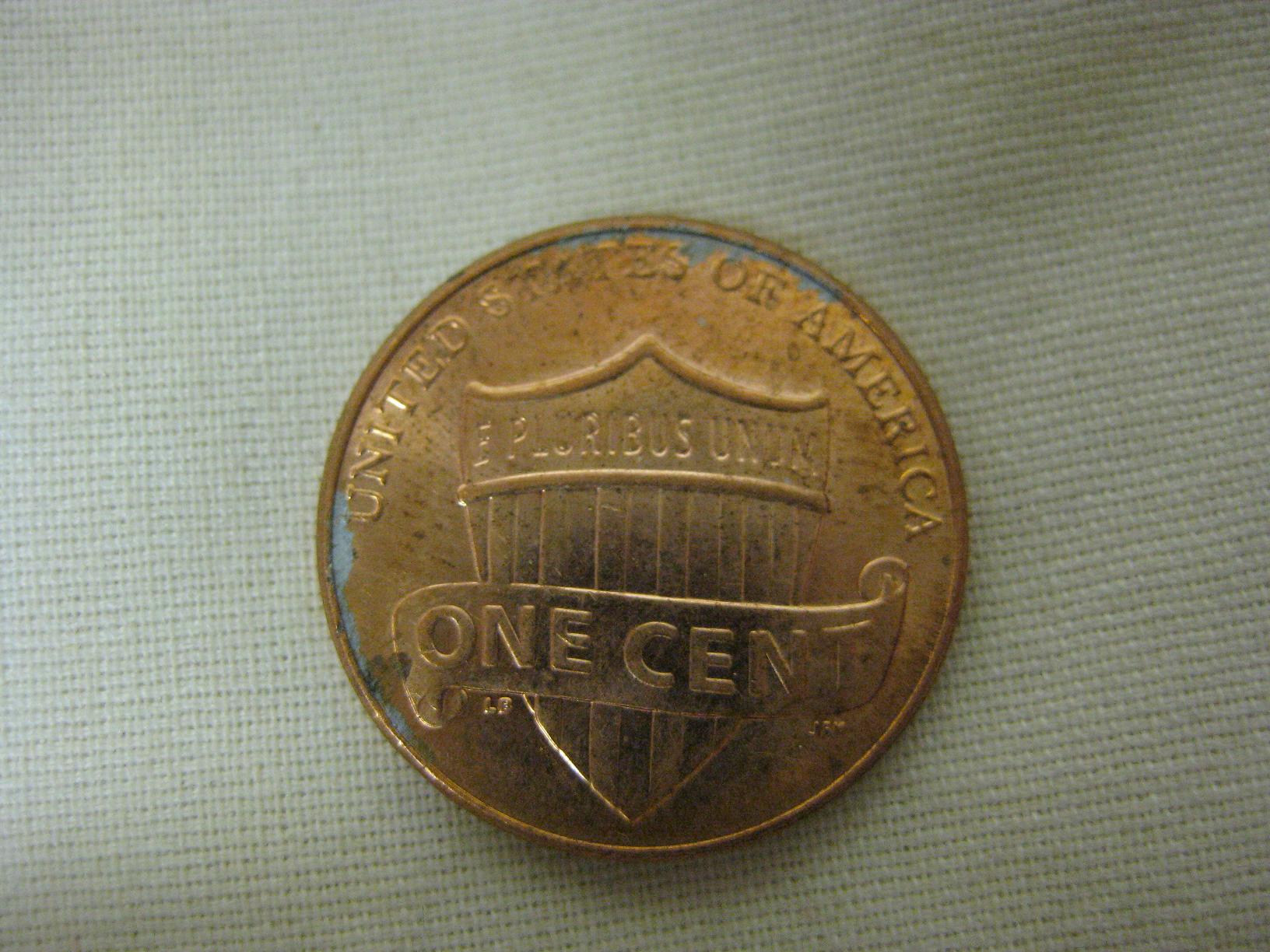 Since we're looking at pennies now - here is recent one in wonderful shape - except that the copper layer is chipping away. In recessed areas only! What in the world? How did this effect occur?