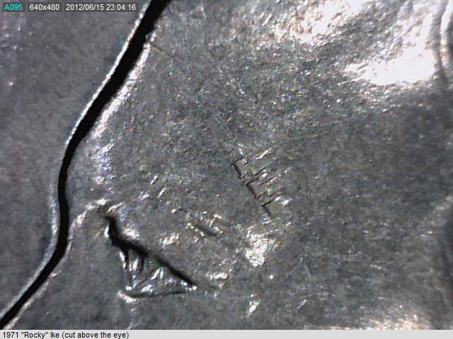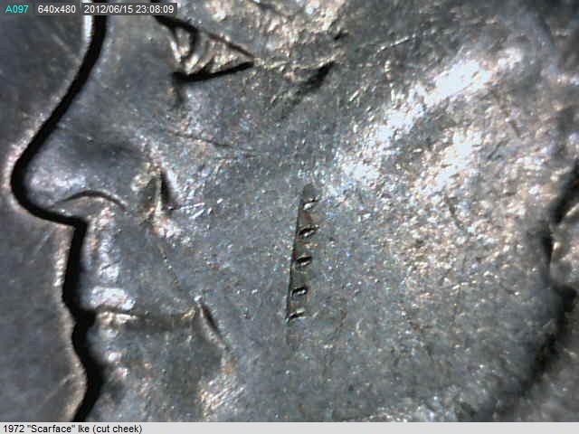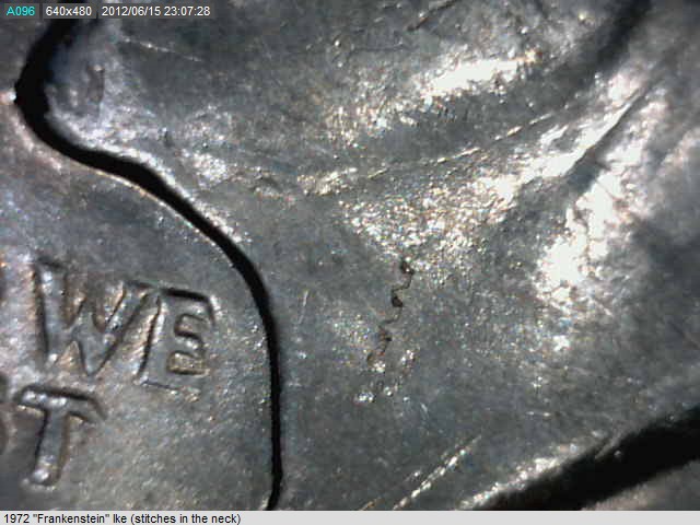 These three Ike's all have an impression. They appear similar in nature (one is 1971, two are 1972), but I don't know how to classify them. My favorite is the 3rd pic, the "scar face" version... I think it looks really cool and I think it is the best sample. But a sample of what? Anyone have a word I can add to my vocabulary?