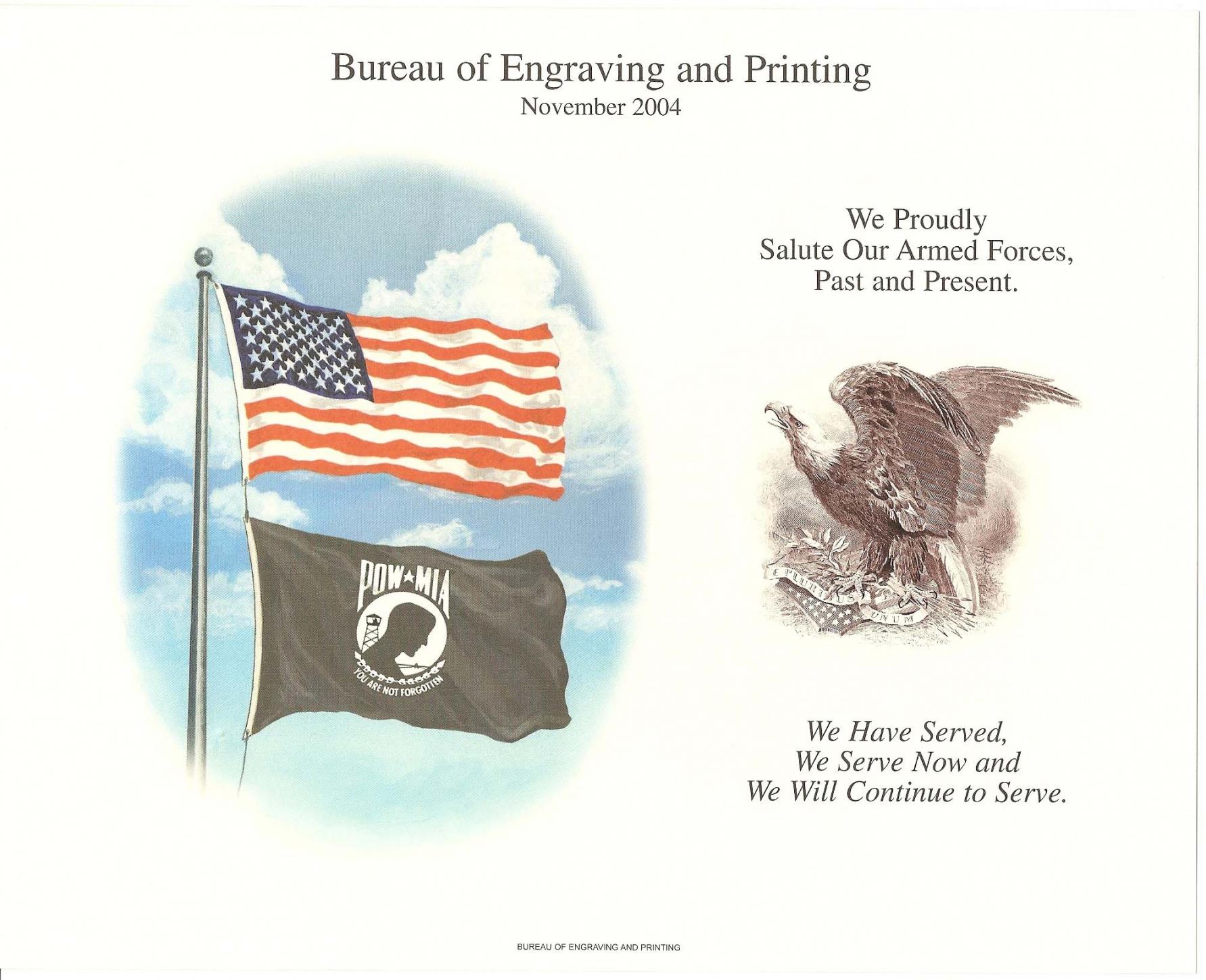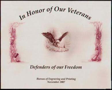I picked up another interesting card recently that led to a bit of research. Like the Family day card posted earlier, this was another "private" souvenir card put out by the Bureau of Engraving and Printing. It was issued last November to commemorate Armed Forces Day (Veterans Day). I did some online searching, contacted another card collector and wrote the BEP for more information. Turns out this series started in 2004. They were produced as program inserts for BEP's annual Armed Forces Day ceremony in DC. I was able to obtain images of each year, except one, although some are low resolution. BEP also provided print quantities, at least for the earlier years, but offered no reason for why they stopped keeping track. 2004: “We Proudly Salute Our Armed Forces" Quantity: 1000 2005: “Armed Forces Day" Quantity: 1000 2006: "Count On Us, Women In the Military" Quantity: 1500 2007: "In Honor of Our Veterans" Quantity: Est. 1000