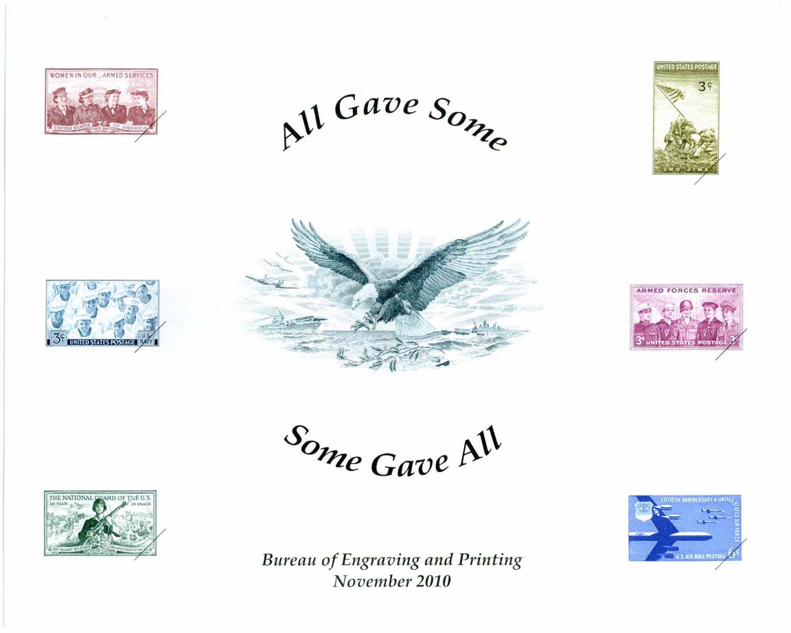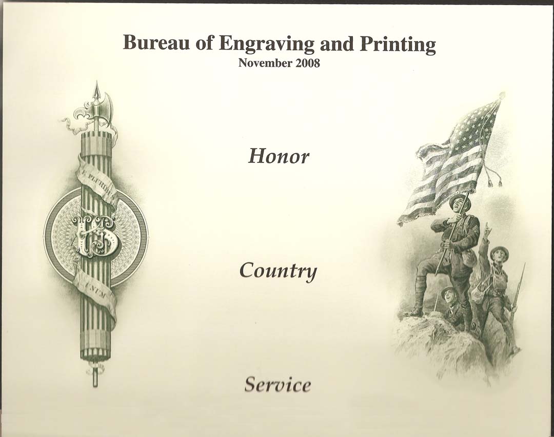 The one year I'm missing is 2009 and I've requested a scan or photo from the BEP (if they provide this I will post later). They provided the title at least: "Honoring All Who Served." If anyone out there happens to have this one I'd love to see it. All the cards have at least one intaglio vignette and a few have several. The 2010 card I bought is entirely intaglio and required seven passes through a press for all the various stamps and eagle. Or a multi-color intaglio press, which I think they have now.