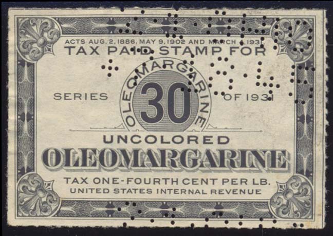 Yeah, butter lobbyists in Washington (they really existed) probably pushed legislation allowing the sale of this as a way to repackage spoiled product that would otherwise go to waste. But no telling how well it sold. Another related story is oleomargarine, which was invented in late 19th century. The the butter lobby saw it as a threat and fought against it, pressing for taxes and expensive licenses for manufacturers. Which resulted in some very nice taxpaids and special tax stamps. Margarine producers were prohibited for many years from using coloring in their product, discouraging sales because it was pasty white. Eventually they got around this by providing a free yellow food coloring packet with each tub and letting housewives mix it in themselves. I remember my dad telling me his mother did this while he was growing up in the 1930s. Here's an image of a later-issue taxpaid I lifted from eBay...