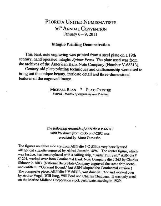 I picked up a scarce one the other day. This one was hand-pulled on a spider press at the 2011 FUN convention this past January. Only 100 cards were pulled. It came with an info sheet that I'll post also. What I like most about this card is the tall ship in the circular vignette. it's a wonderful image, titled "Under Full Sail," engraved for Continental Bank Note in 1883 by Charles Skinner. It also appears on a Mexican 50 peso note and a Commemorative Panel that I'll post, too.