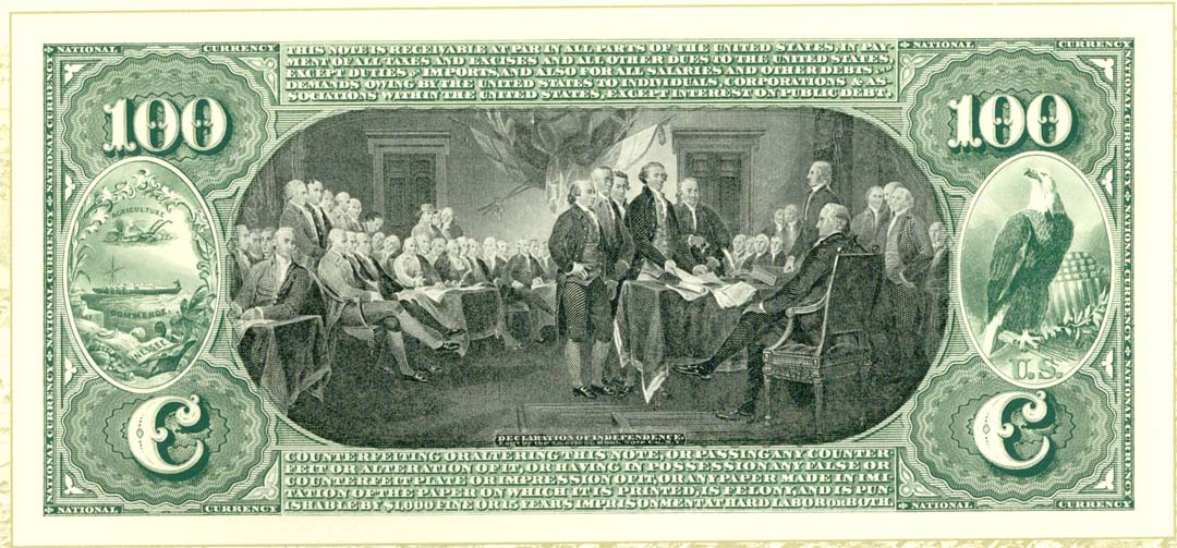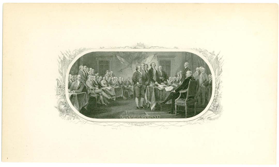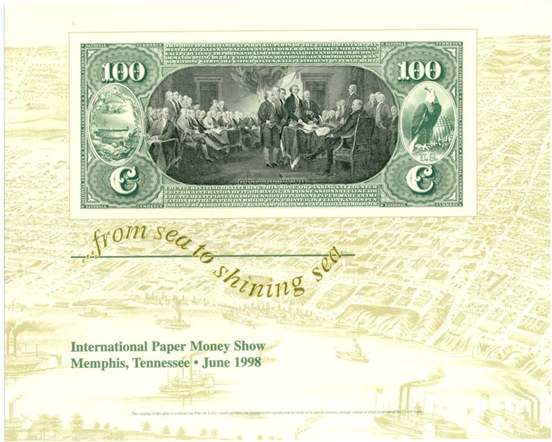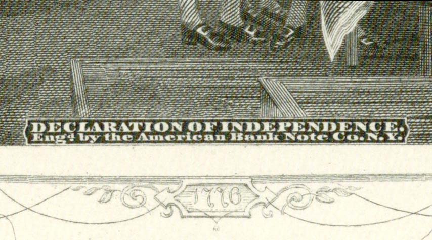 Below is a scan of B226, issued by the Bureau of Engraving and Printing for the IMPS show in 1998. It features a really nice intaglio print of the back of a First Charter $100 National Bank Note. The central engraving of the Signing of the Declaration of Independence also happens to be one I have in my collection of BEP vignette prints. I keep these two in the same album, but hadn't studied them closely until yesterday. At the bottom of the vignette print is the imprint "Eng'd by the American Bank Note Co. N.Y." Upon closer observation, the souvenir card has the same imprint, but it's partially obscured by the overprint of the green frame.