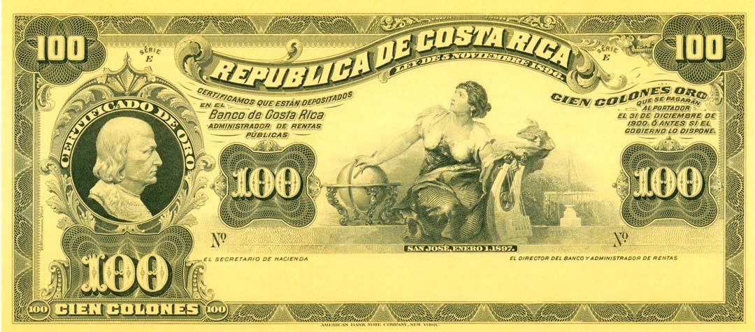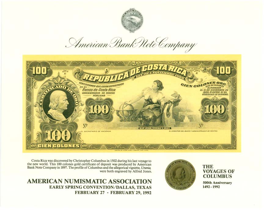 Filled one more hole in my dwindling list of American Bank Note cards. This is another in the series commemorating the 500th anniversary of Columbus landing in America. Very nice (and large) Costa Rican gold certificate. The U.S. wasn't the only country to add a yellow tint to their gold notes.