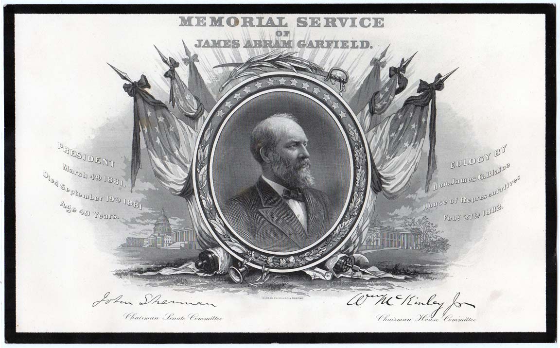 This is the memorial card for President James Garfield, who was assassinated in 1881. The card was engraved and printed by the BEP and currency buffs will recognize the portrait as the same one that appears on Series 1882 $5 national bank notes. This card was also bound into the official Memorial Book that contained the memorial addresses delivered in the House of Representatives. But the individual cards, framed in black, are scarcer.