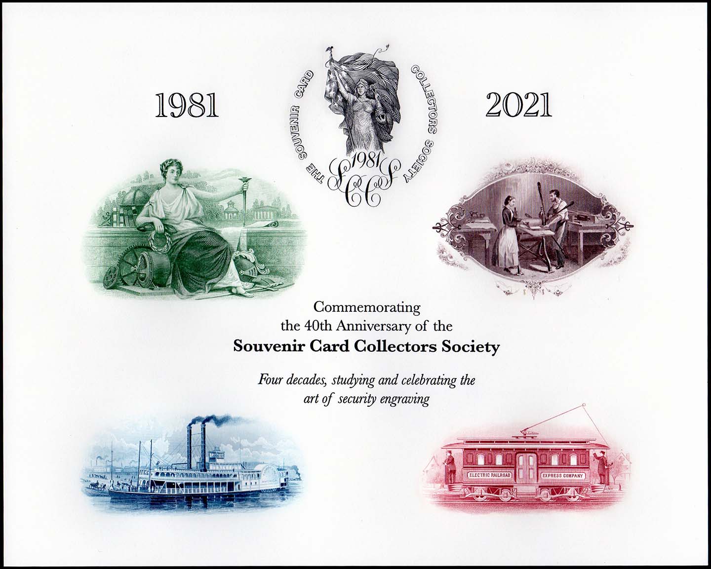 Wow, it's been almost a year since my last post on this thread! I just wanted to alert people to a nice card that's coming up. This was kind of a pet project of mine to find a printer who could pull this off -- it's the 40th Anniversary card for the Souvenir Card Collectors Society. We wanted to do something special this year, so I came up with this design using antique printing plates borrowed from one of our members. It's all intaglio printed and took seven passes. We will have these at our table for the ANA show, next week in Chicago.