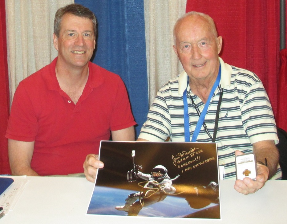 I think one thing that all coin collectors do is think to themselves, "If only this coin could talk... where has it been, and who has handled it?" This coin flew on Gemini 4 in 1965. At the time it was the only space flown gold coin that I knew of. It turned out there were several more that flew on that flight, but from the images that I've seen, this one is still the one in the best condition. The gold coins were brought on the flight by Jim McDivitt. McDivitt, the Commander of Gemini 4 (and Apollo 9), was the first mission Commander of the New Nine astronauts, the second group of astronauts picked by NASA. Many people think this was the finest group of astronauts ever picked by NASA. Neil Armstrong was a member of this group. So for McDivitt to be picked to be the first mission Commander from this group tells you all you need to know about how competent he was. The USSR had humanity's first spacewalk (EVA) in March 1965. Gemini 4 was the flight that America had its first spacewalk. Ed White II was the person who did the EVA. Even today, the pictures from that spacewalk still look Great. I've met Jim McDivitt multiple times and enjoyed talking with him. He's a nice guy. Here's a pic of yours truly with Jim holding the coin and a picture that he took of Ed White that I got him to sign.