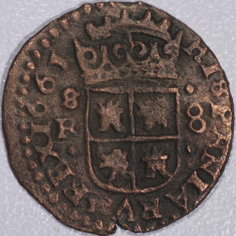 Strangly enough I have the following one on the way 1662 Spanish colonial 8 Maravedi Philip IV Bust right Crowned shield of Castile & Leon Value/date/mint mark Y = Madrid KM171.5 When it arrives I will post a scan, from what I can gather they were made in Spain but for use in the colonies? Best person to ask is possibly Doug, he knows lots about this era (between you and I, I believe he was actualy there )