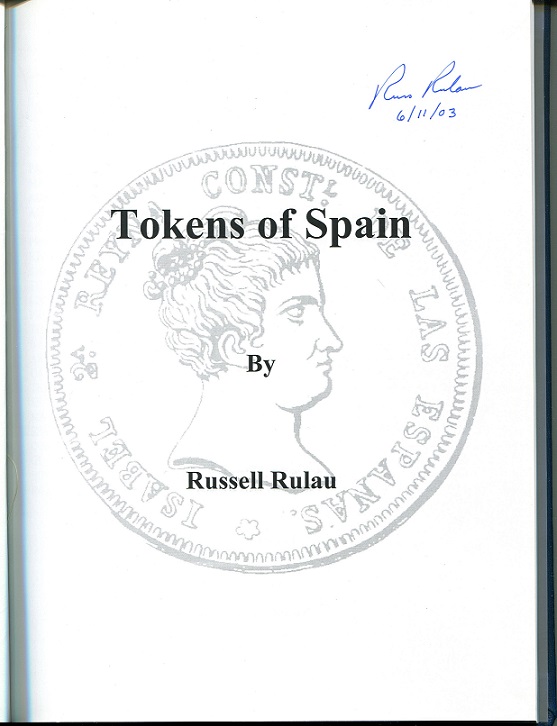 The Tokens of Spain 1800-Present by Russell Rulau, 2003 published by Numismatics International. Hardcover, 174 pages, 8.5 by 11 inches, English text, extensively illustrated with black and white photo’s. Near mint condition. This copy is signed by the author and is printed on glossy paper. This is a very rare book. A search of the internet could not find one copy for sale anywhere. This is the only copy I have ever seen. $60.00 post paid to any USA address. Foreign address postage is very expensive and will be determined at the time of the order. Once and only PRICE REDUCTION $50.00.