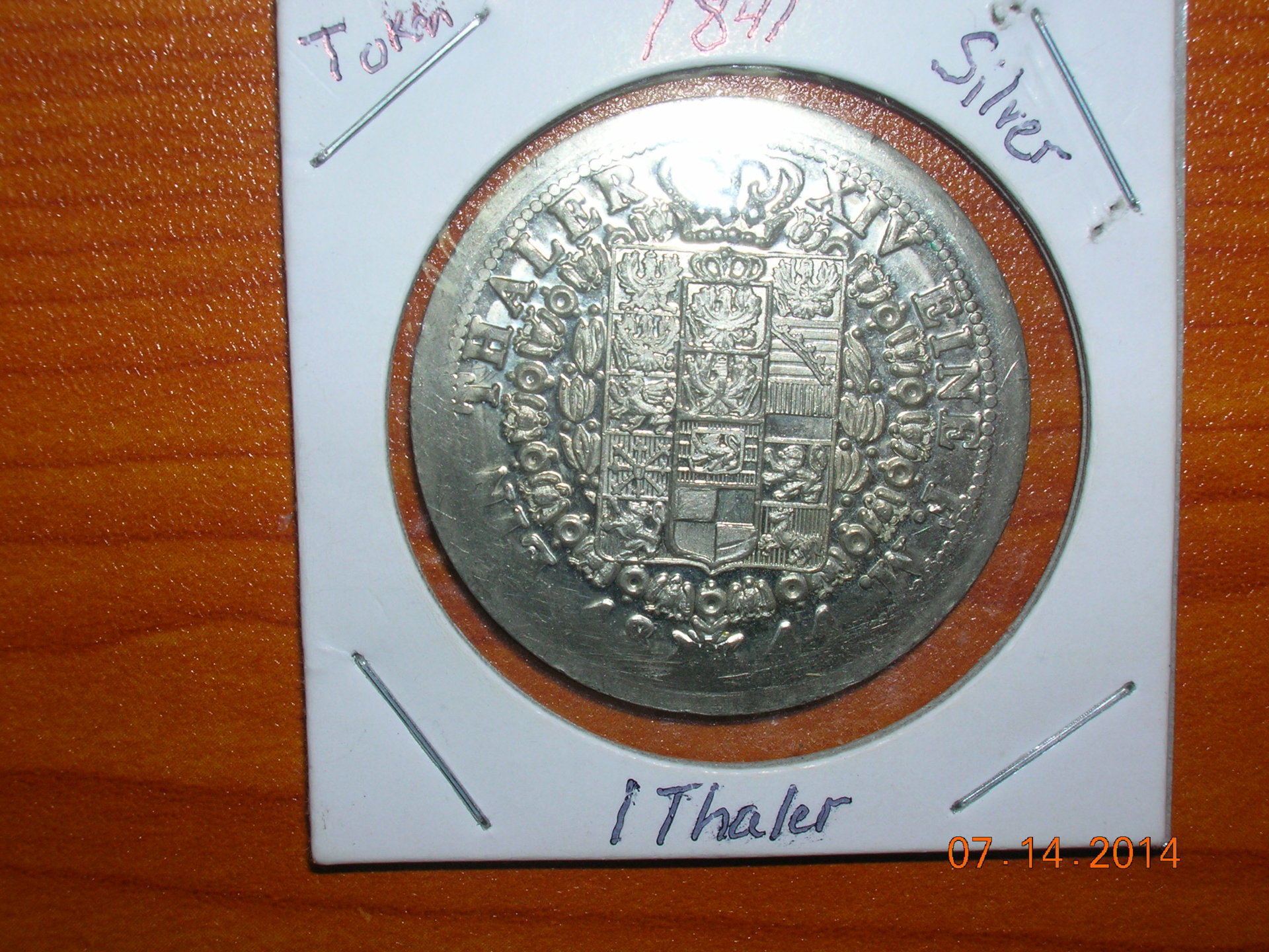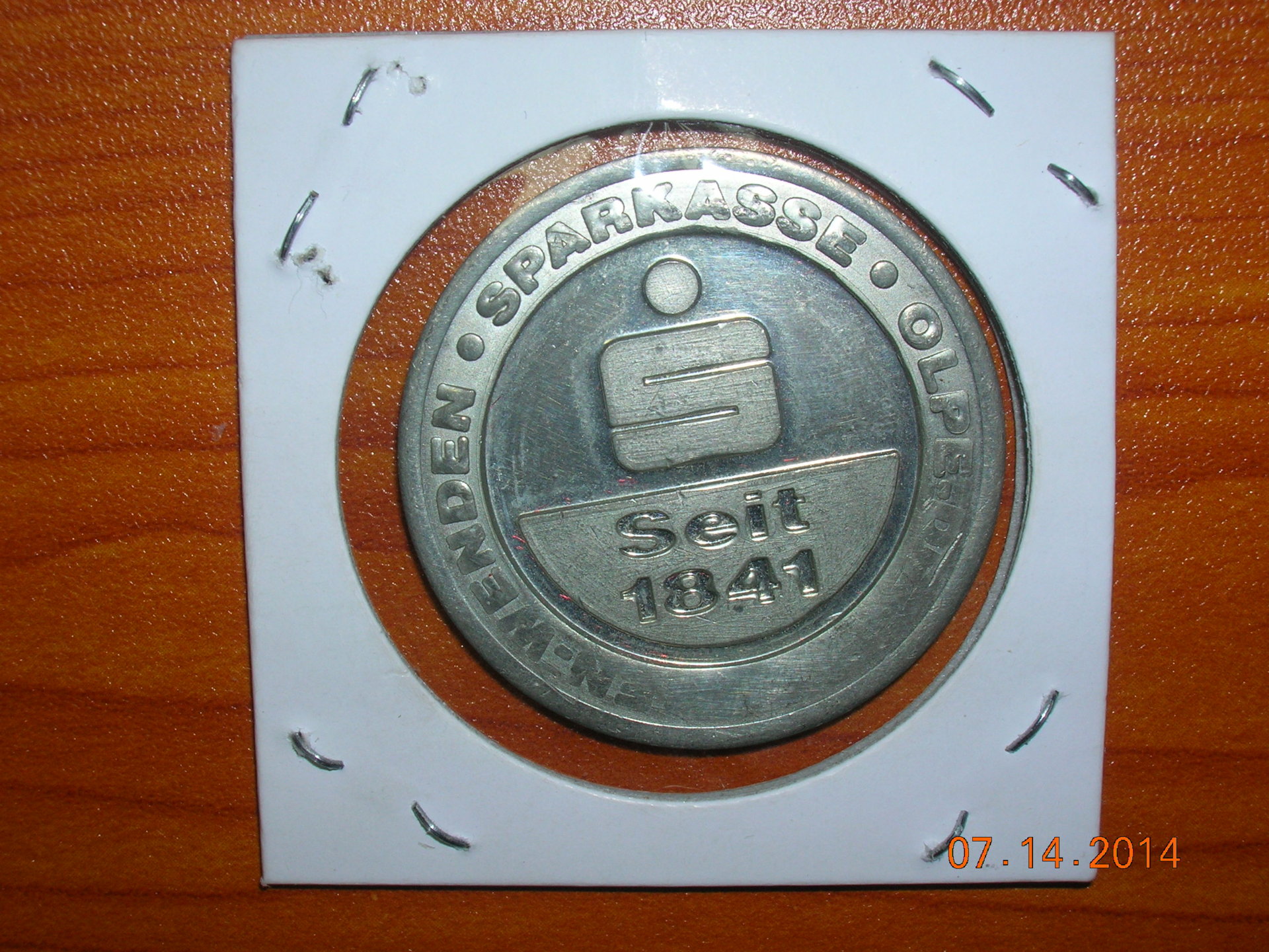 Hello everyone it has been sometime since I have logged on, have been fighting a brain disease. I have recently been given some medals and tokens and one has stumped me so I thought someone could help me. I think it is a medal/coin maybe a commemorative promotion from a bank .S sparkasse Germany. It may be silver and it's worn? OBVERSE: outer rim text reads: en.wenden.sparkasse.olpe.drolshagen Center displays a big DOT with letter S under DOT SEIT 1841 REVERSE: outer rim text reads: 1841 XIV EINE F.M. THALER - Center displays the crown shield/coat of arms with ivy and symbols within and surrounding the shield There is more text but it is worn. Take a look at the pictures, Thanks Steve