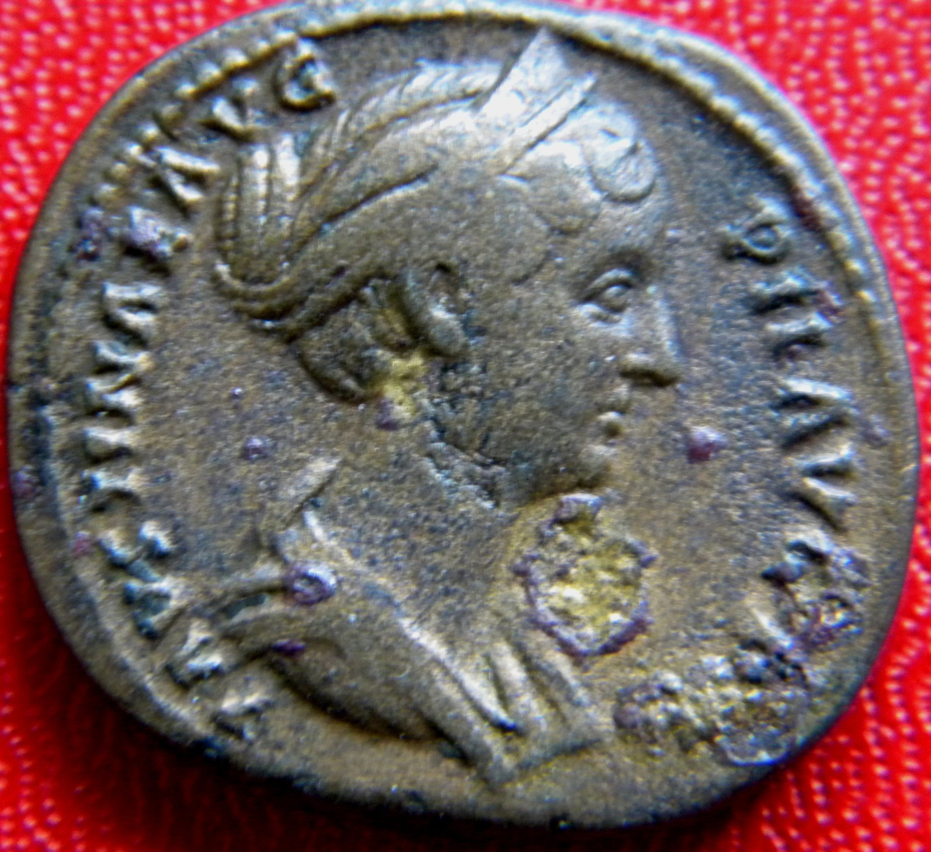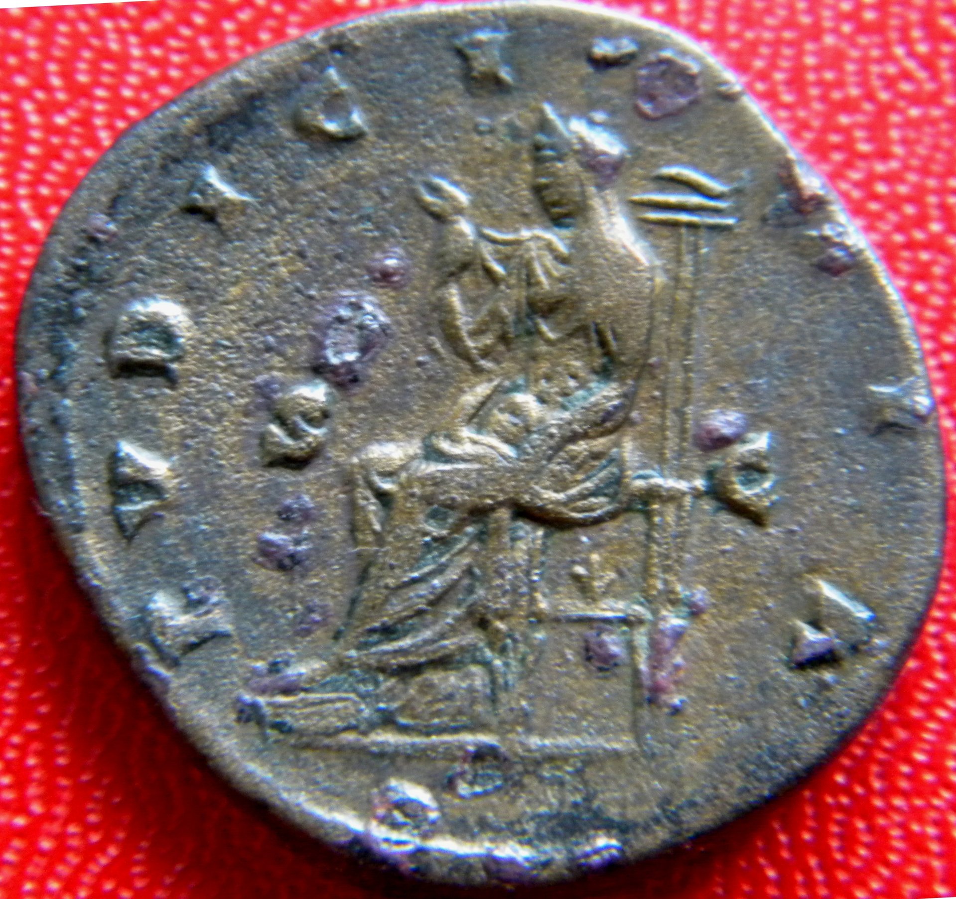In my description I have as : Pudicitia seated left, veiled & holding hand on breast. But it does look like she may be sneezing.