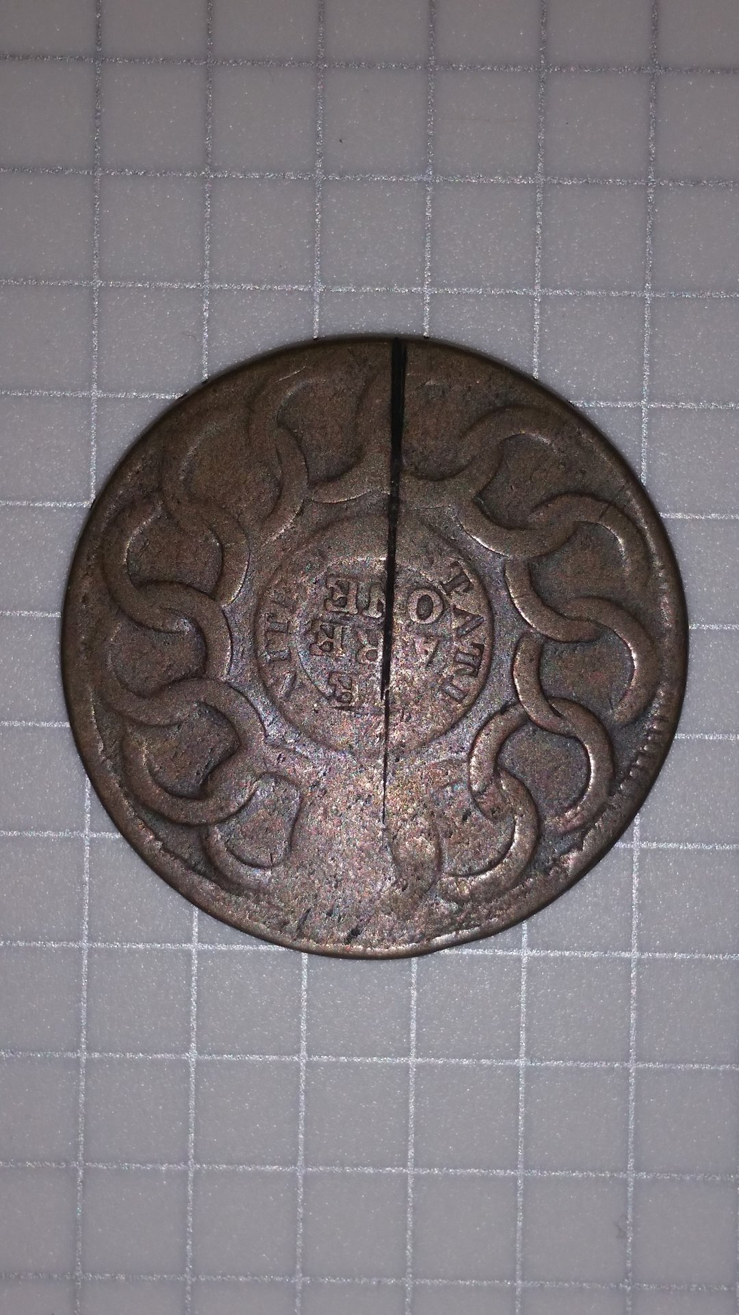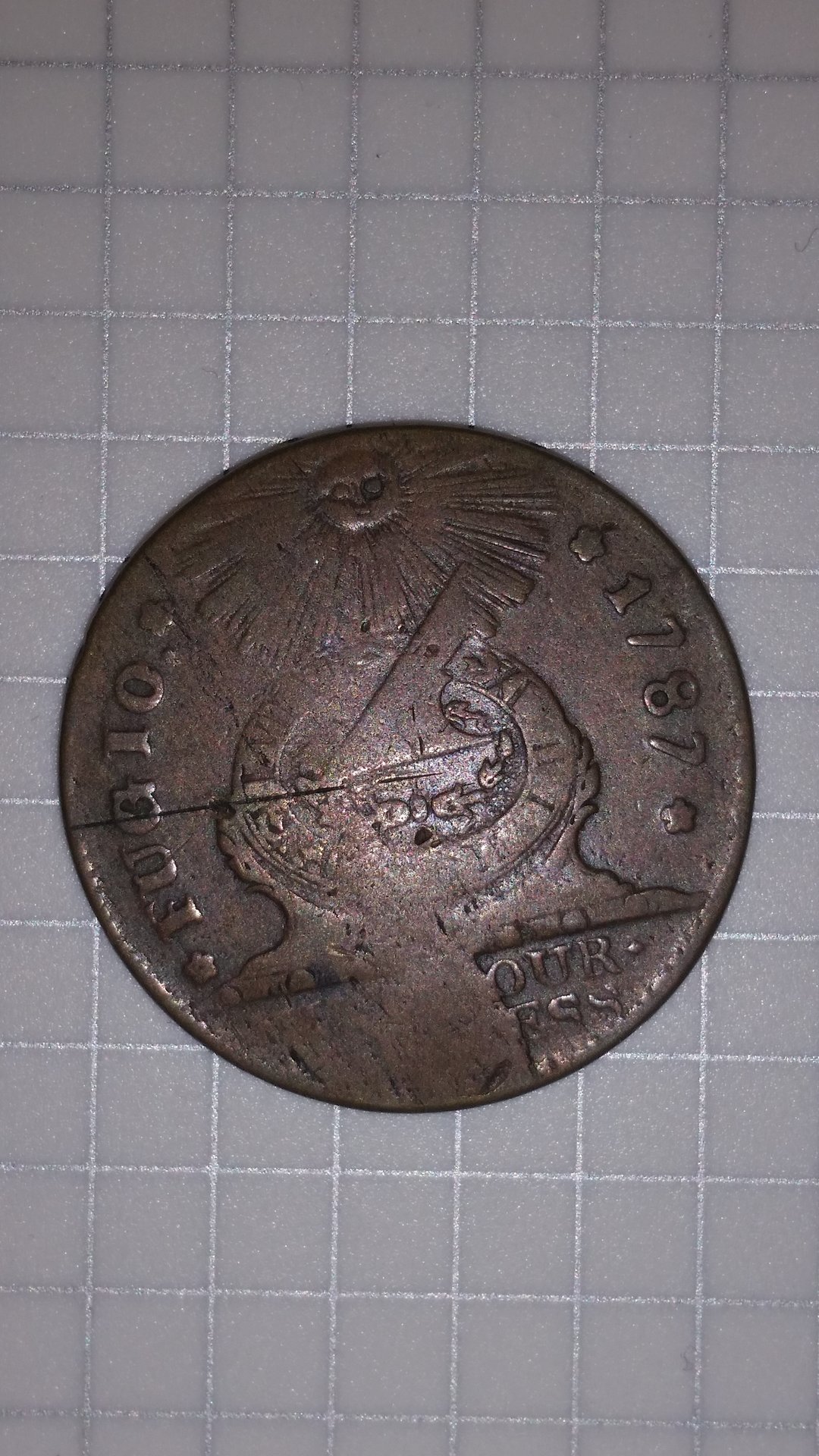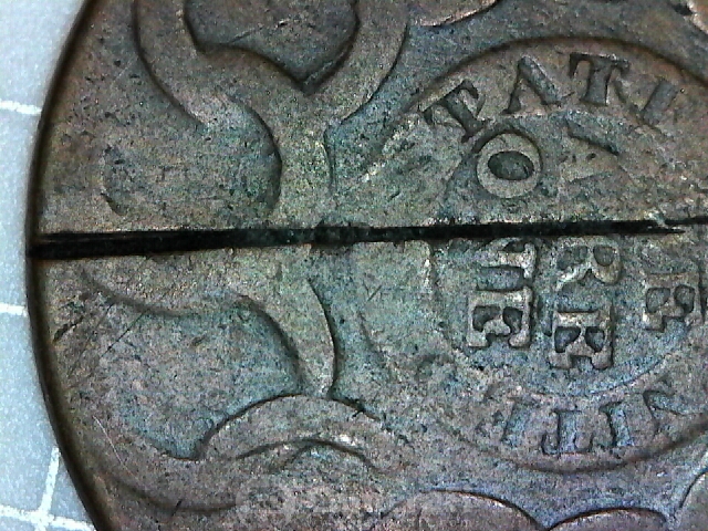 The Fugio is a late state 8-X, fairly common. A Bank of New York coin. Examples are plentiful - I was actually looking at this item when Doug reached out to me. I was seriously considering buying - the seller describes it as a split plantchet and his pictures are misleading. Not saying this is intentional or dishonest. I have a bad habit of doing most of my shopping and Cointalking on my phone, so images are small and difficult to enlarge for better viewing. Just as a learning experience for anyone interested in Fugios, the 8-X in its last two die states can *easily* be identified by the halfmoon die crack across the better part of the lower obverse. This was the terminal die state for obverse die #8. One of those identifiers that you can use, even in well worn examples. My 8-X is significantly double struck, but this identifier allows concrete identification, even though part of the second strike and poor planchet quality mask much of the lower obverse: