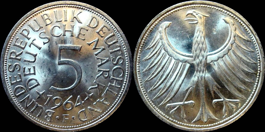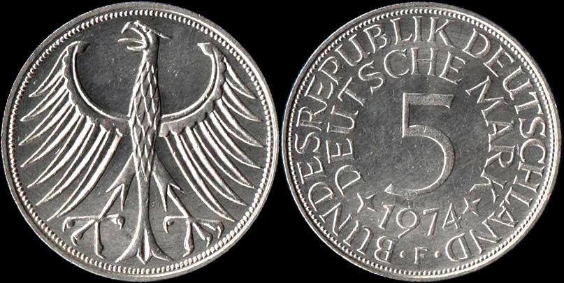 Yes, I like that design (by Albert Holl) too. Also because there is nothing but the eagle on that side - everything else, all the text, is on the other side and the edge. The silver 5 DM circulation coins were made until 1974, but the commemorative issues (with the same specifications but occasion specific designs) were issued until 1979. In fact, we have "always" been able to get the new silver collector coins (5 DM, 10 DM, and then €10) at face value here. Well, that came to an end this year ... Christian