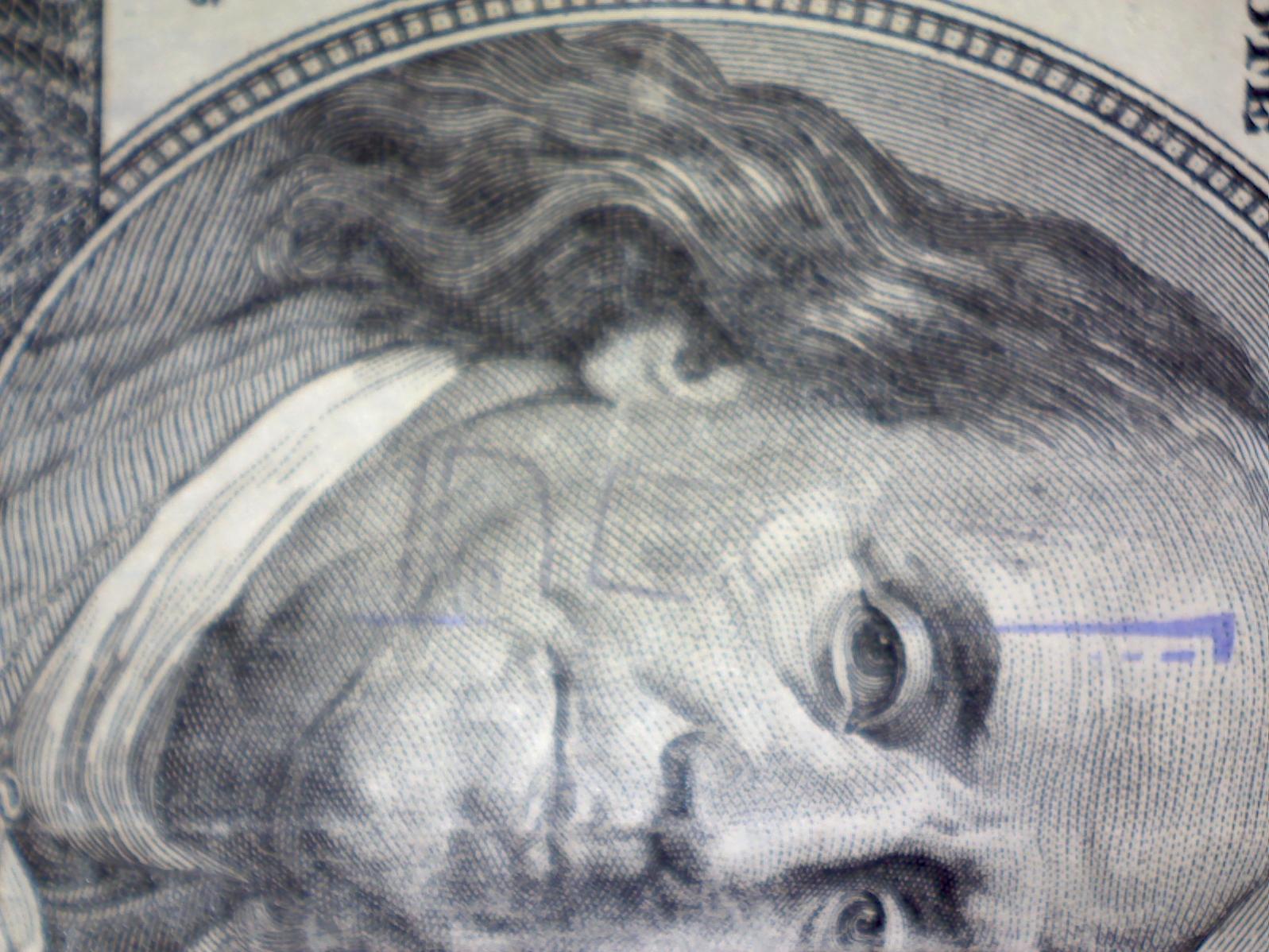 I know this is post damage, but I am wondering if anyone might know what the stamp is from and why is it on the $ 100.00 bill ? Is it a bank stamp ? Dave