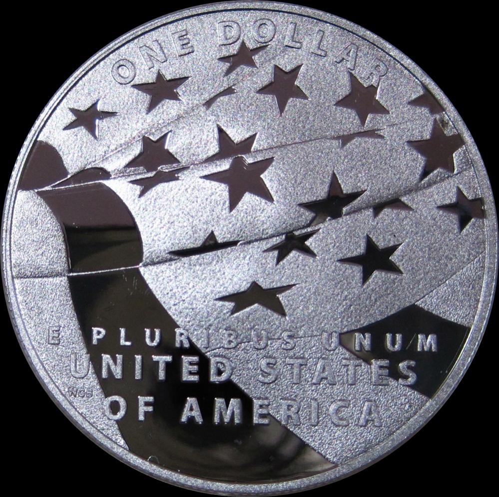 From the mint's website: "The obverse (heads side) design of the 2012 Star-Spangled Banner Commemorative Silver Dollar is emblematic of the theme "The Battle of Baltimore at Fort McHenry." It depicts Lady Liberty waving the 15-star, 15-stripe Star-Spangled Banner flag with Fort McHenry in the background. Inscriptions are LIBERTY, IN GOD WE TRUST and 2012. The reverse (tails side) design is emblematic of the theme "The Star-Spangled Banner" (the flag). It depicts a waving modern American flag. Inscriptions are ONE DOLLAR, E PLURIBUS UNUM and UNITED STATES OF AMERICA."