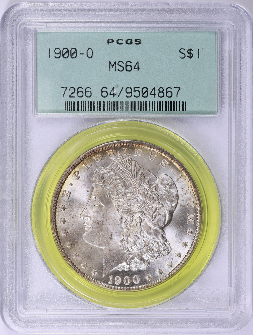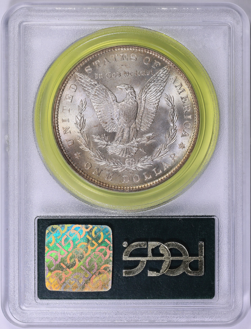 The Morgan dollar in the pics below is coming up for auction at Great Collections in a couple of weekends. The yellow ring in the middle which secures the coin from rattling or rotating is unusual. I’m assuming that it was originally colorless but reacted to light or maybe an unusual atmosphere and turned yellow. According to the PCGS website, a few of these slabs were made with green rings, but I’ve never seen one. Mike
