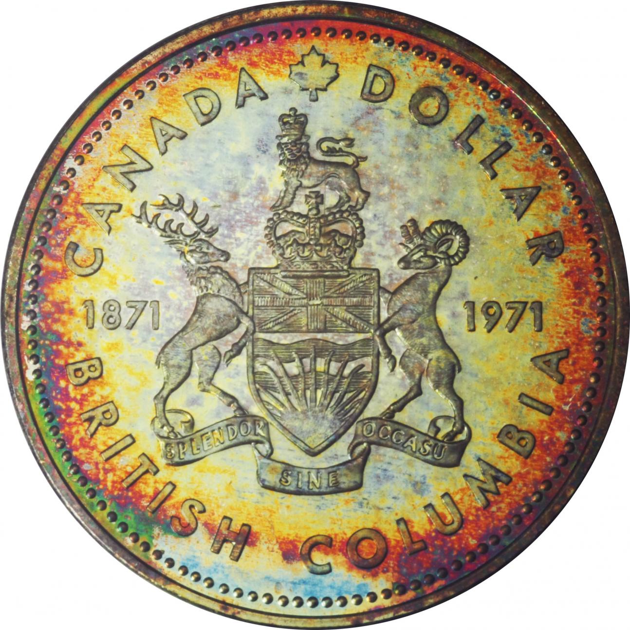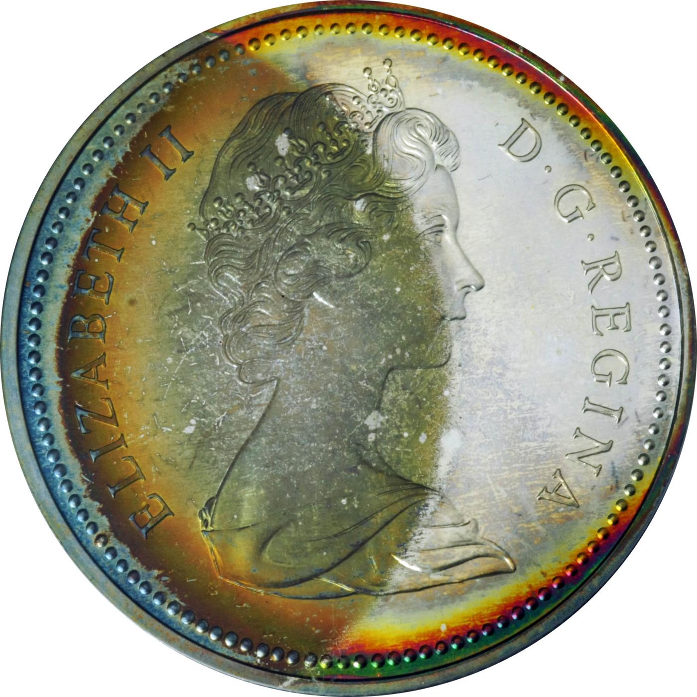 Nice looking dollar. I actually have three of these in the original packaging that are really nice looking and have also toned very colorfully. I have no idea what caused the unique obverse toning on this example. I think they were issued obverse down in the cases but i could be wrong. They were originally issued in jewelry style "clam shell" cases with just a plastic insert to hold the coin. This was before they placed them in lenses. The inside of the "clam shells" has a red velvet like material. When i get some time this week i will post pictures of my three. I don't really collect Canadian, but i picked mine up at a very low price from an ebay seller whom i had done business with in the past. One look at all the colors and i knew i had to have them.