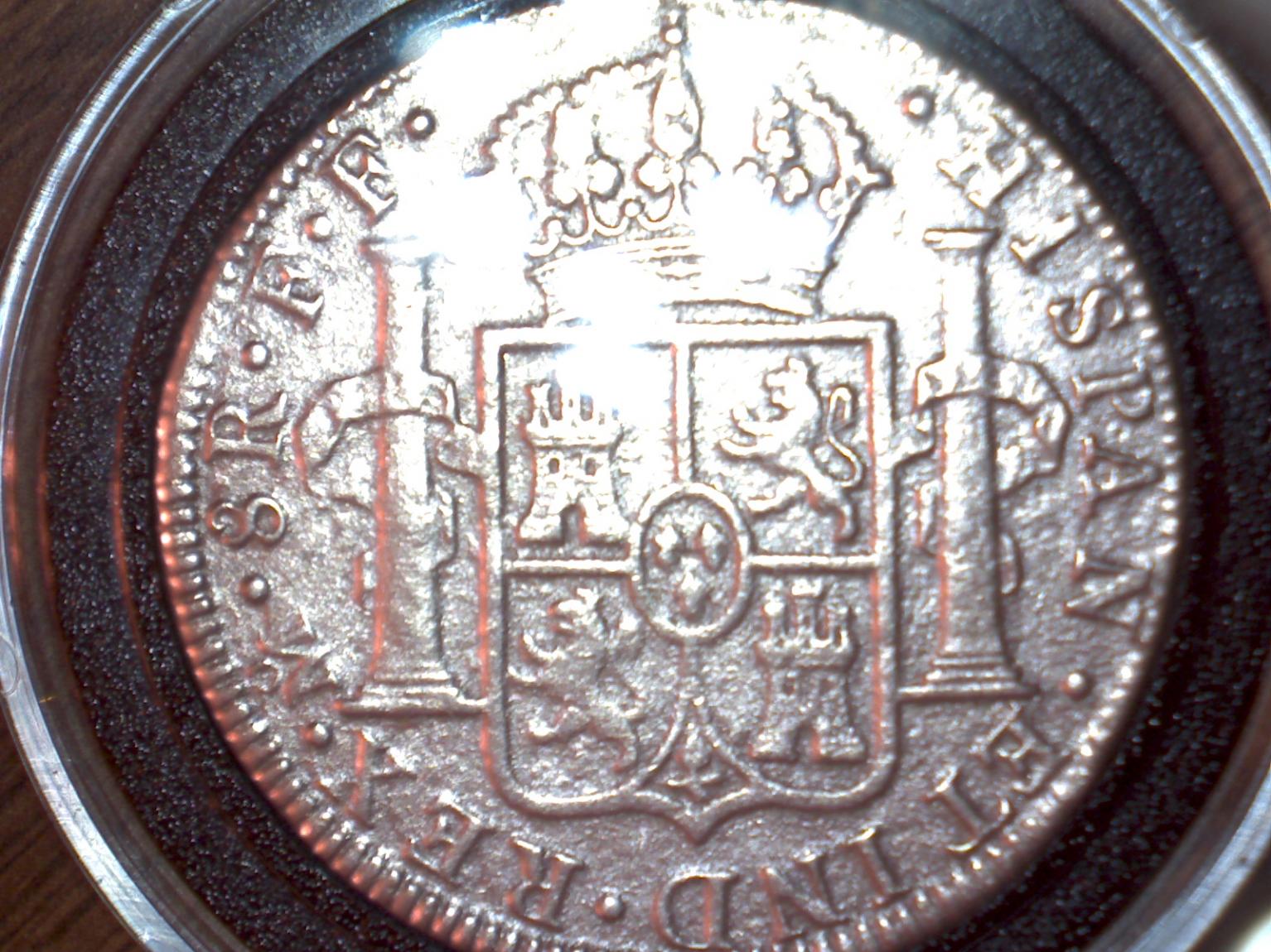 This is supposedly a 1783 Spanish 8 Reale Shipwreck Coin. If it is a true old sunken treasure coin, it is in remarkable condition. I read that these were originally made of silver. This coin appears to be cast or very eroded. It could be that this is a fake coin conditioned to resemble a coin under water for many years. What is your opinion and condition of this coin ? PS - Sorry about the pictures. I can't adjust the bright lights on the scope. Dave