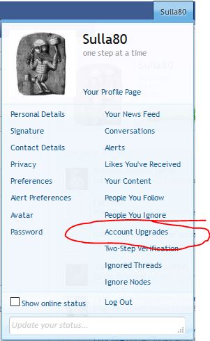 Just click on your name on the Coin Talk top navigation bar then click on “Account Upgrades” in the right column of the Profile Page menu.