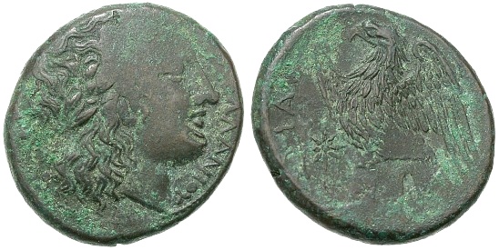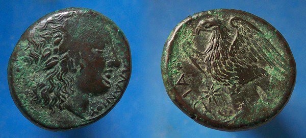...and #4 of 4 just came I've been wanting a nice one from Syracuse since I've been collecting. This one has a partial flat strike but I really like it. I think get a nicer one someday though. Syracuse, Sicily, Hiketas, 288 - 279 B Bronze AE 23, Calciati II p. 312 ff., 168 (various obv symbols), EF, partial flat strike, 7.564g, 22.8mm, 180o, Syracuse mint, obverse DIOS ELLANIOU, laureate head of young Zeus Hellanios right, uncertain symbol behind head; reverse SURAKOSIWN, eagle standing left on thunderbolt, wings open, star left "Hicetas was tyrant of Syracuse for about nine years. The only recorded events during his rule are his victory over Phintias, tyrant of Agrigentum, and his defeat to the Carthaginians at the river Terias. He was expelled from Syracuse by Thynion shortly before Pyrrhus arrived in Sicily."