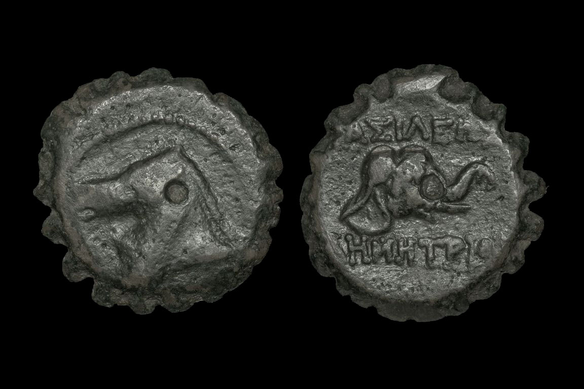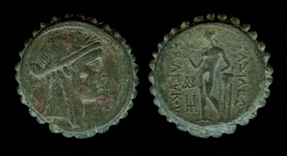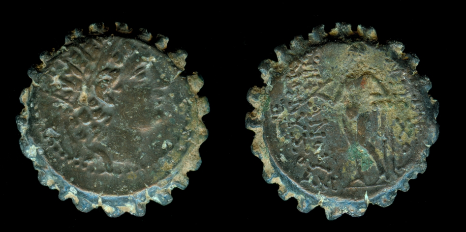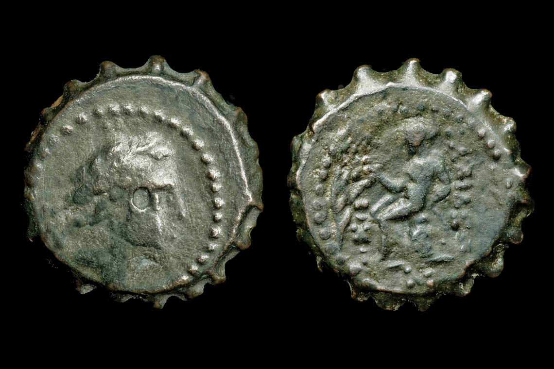 Here are a couple of serrated Seleucid coins of Antiochus IV: Laureate head of Apollo / Apollo seated on omphalos, & Diademed, radiate head of Antiochus / veiled and draped standing goddess holding long scepter