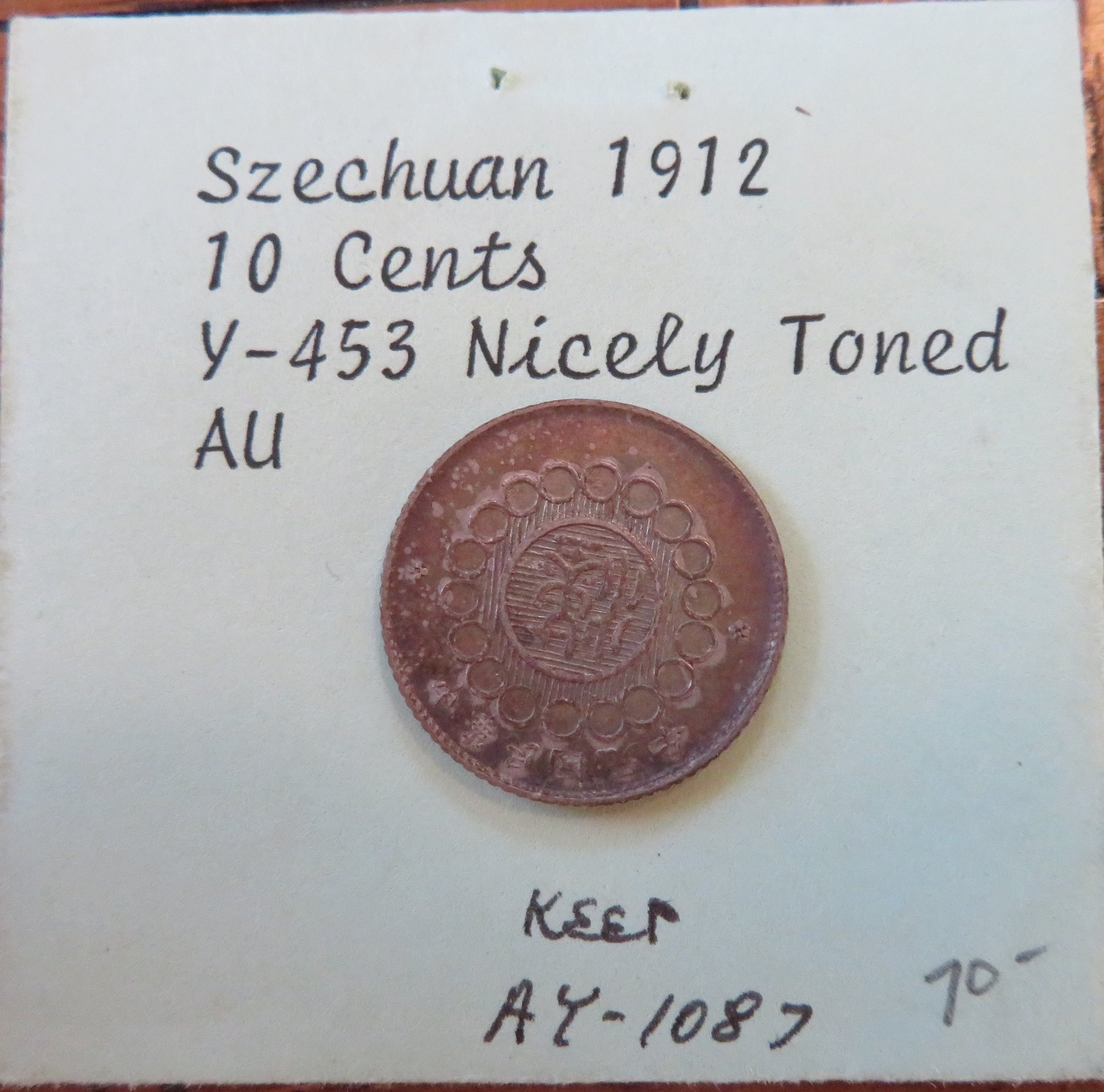It is 2019 Krause World Coins catalog number Y#453, 10 Cents, China/Szechuan Province, silver, 1912, mintage-370,000 grade/value VG8-$13.00 F12-$37.50 VF20-$80.00 XF40-$200.00 MS60-$400.00 guessing on the grade as being VF-XF ? wait for more opinions on grade. If you can get $650 for it take it.