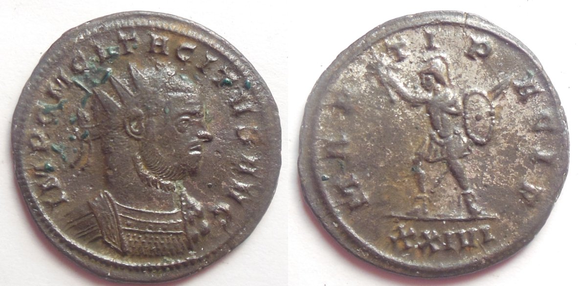 Tacitus AE Antoninianus. 275-276 AD, 3.6g, 23mm OBV: IMP C M CL TACITVS AVG. Radiate and cuirassed bust right. REV: MARTI PACIF. Mars advancing left, holding branch, spear and shield. XXIVI in ex. REF: Unlisted? I can't be certain but I looked on Wildwinds as I usually do as a starting point and then consulted RIC Volume V-1 and couldn't find a match for this coin. I have not seen any that use the value, twenty parts bronze to silver. This one is kind of confusing to me but you can see some silver wash on it. Wikipedia copy and paste history.