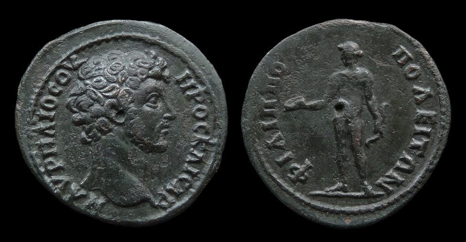 AE Diassarion. 10.44g, 26mm, THRACE, Philippopolis, circa AD 139-161. Varbanov 805. O: Μ ΑVΡΗΛΙΟC ΟVΗΡΟC ΚΑΙCΑΡ, bare head of Marcus Aurelius to right, with neat beard. R: ΦΙΛΙΠΠΟΠΟΛΕΙΤΩΝ, Apollo, nude, standing left, holding a phiale in his right hand and his bow in his left.