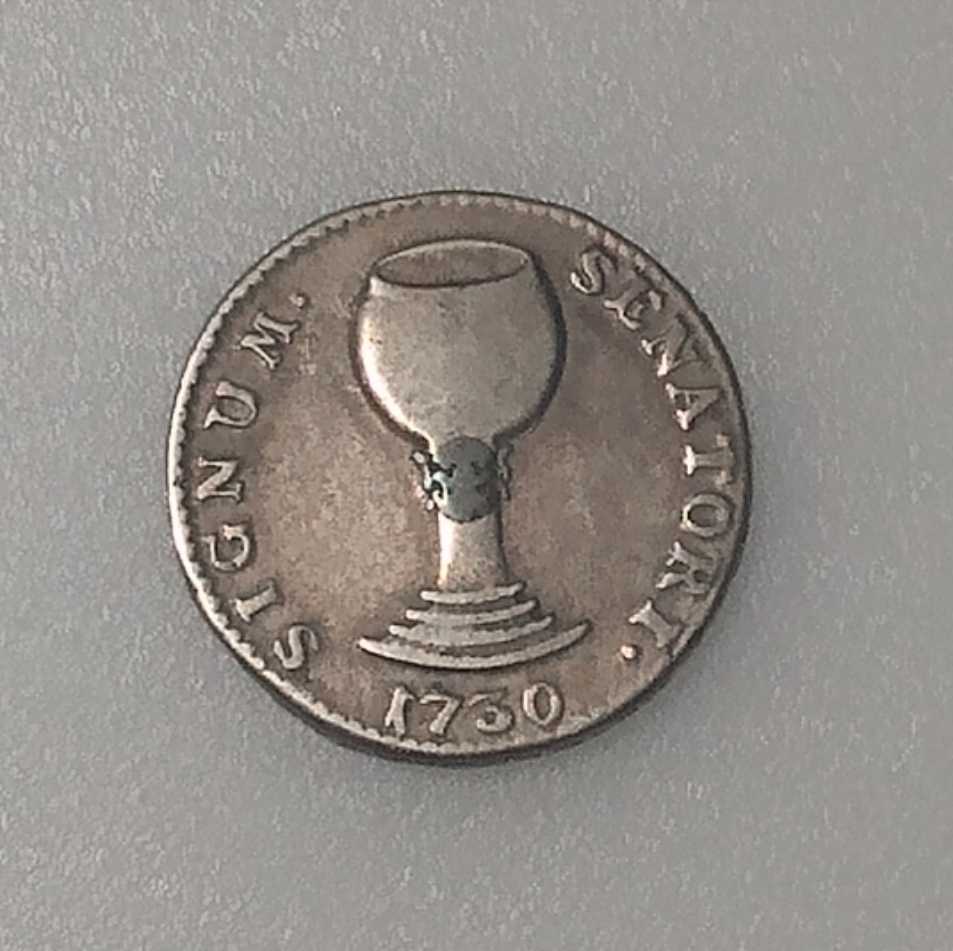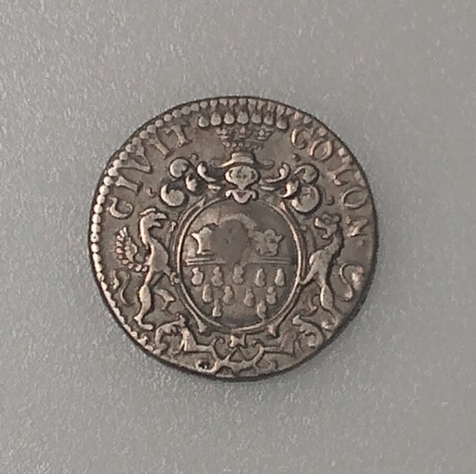 A city council wine token from Cologne, minted until 1796 with a frozen date. A copper plug in the center to thwart counterfeiting.