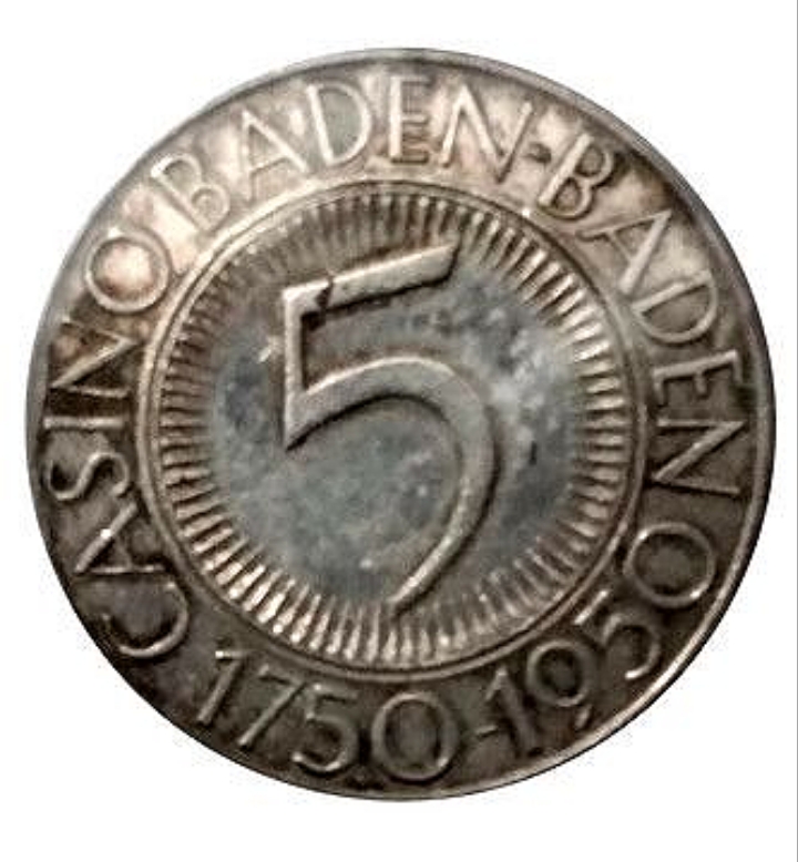 Silver 5 Mark casino token from Baden-Baden. There are a range of denominations, the higher ones struck in gold!