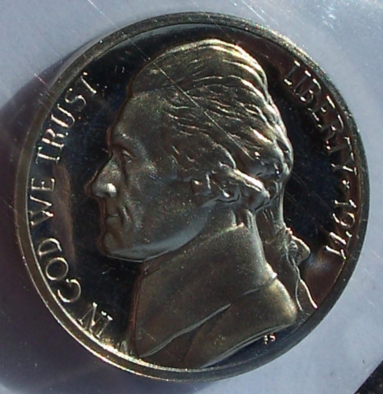 I have not messed with removing this 1971 No S Jefferson Proof Nickel from the holder yet although I have had it in the sealed flip since it arrived at my house on March 1 2011. Some calm day I may send it off for grading. The lines and such you see on it are on the flip in the plastic. I don't know what it will grade. I hope high but I don't care too much since it is a nice looking example. I wanted one since the middle 1970's but finally got it to add to my collection. It is not my most valuable coin but it's up there in the top 5 that I own. It is however, my favorite coin in my collection. The avatar is just another image I worked on of this same coin. The reverse is just as nice. According to Stack's a little over a year ago .... 1971 S-Less Proof Jefferson Nickel: The Guide Book gives the precise figure of 1,655 as the mintage of sets with this rarity. PCGS has certified 164 of these and NGC 54. Total certified by PCGS and NGC: 218