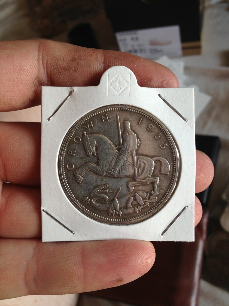 the crown 1935 was issued for the silver jubilee of George v--should have edge year XXV--known as the rocking horse crown