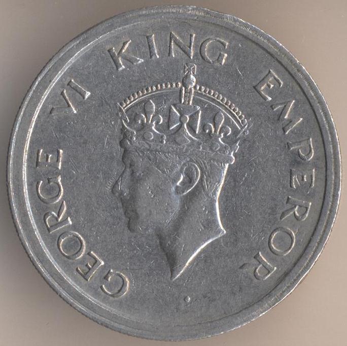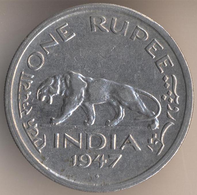 One rupee 1947, nickel, weight - 11,8 g., size - 28 mm, thickness - 2,48 mm, mintage - 118028000 pcs. Mumbai (Bombay) Mint. Engraver: P.W.M. Brindley.