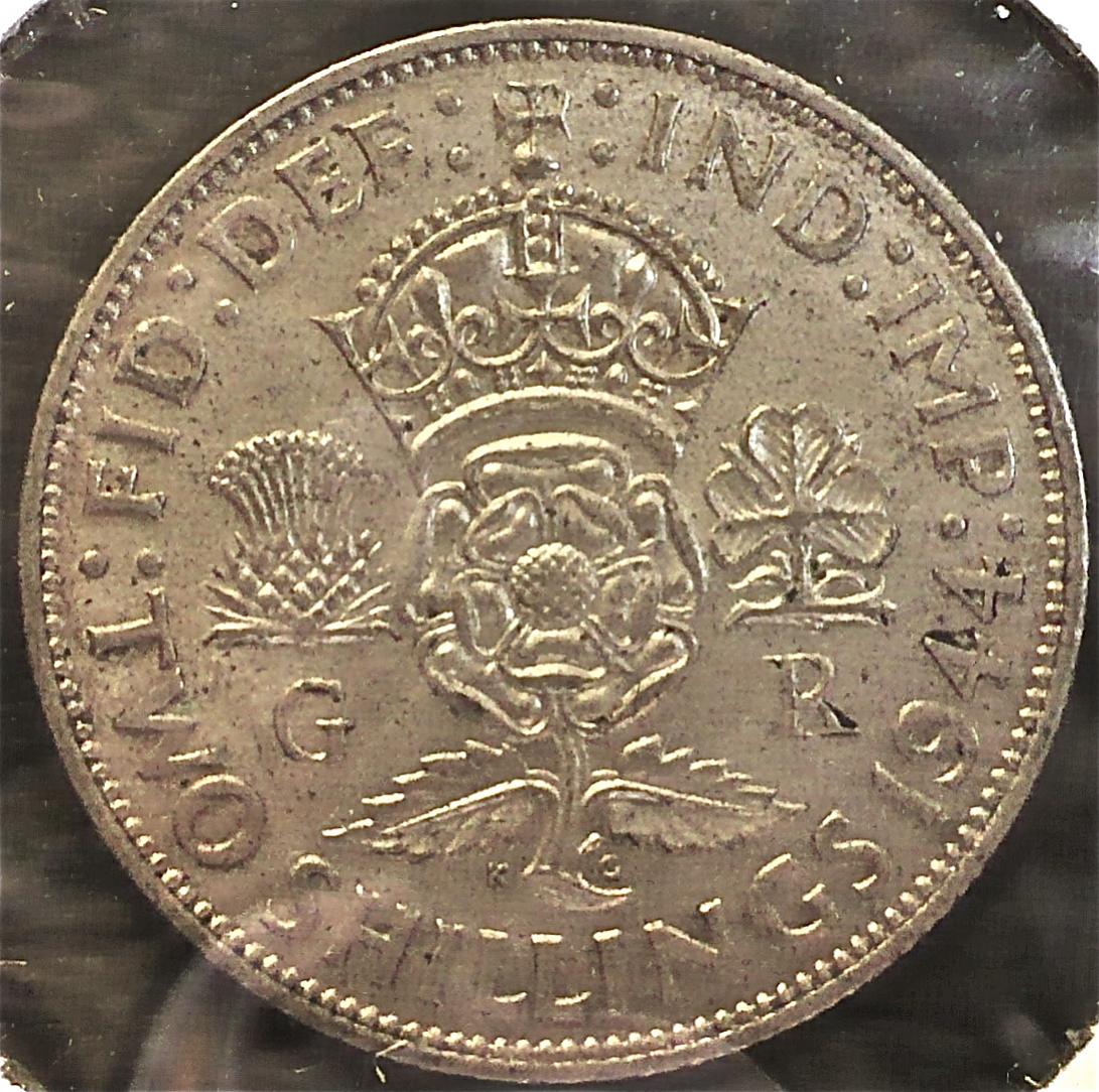 1944 British George VI Two Shillings Another find in today's post. Sloth and haste worked successfully against peeling it out for specs...I'm sure you'll forgive. One of these days I'll have to attempt understanding of the British coinage denominations. Shilling, Farthing, Cent...I know there are others but none of 'em make any sense to me. Wot's 'two an' six'? Meaningless to a Yank, eh?