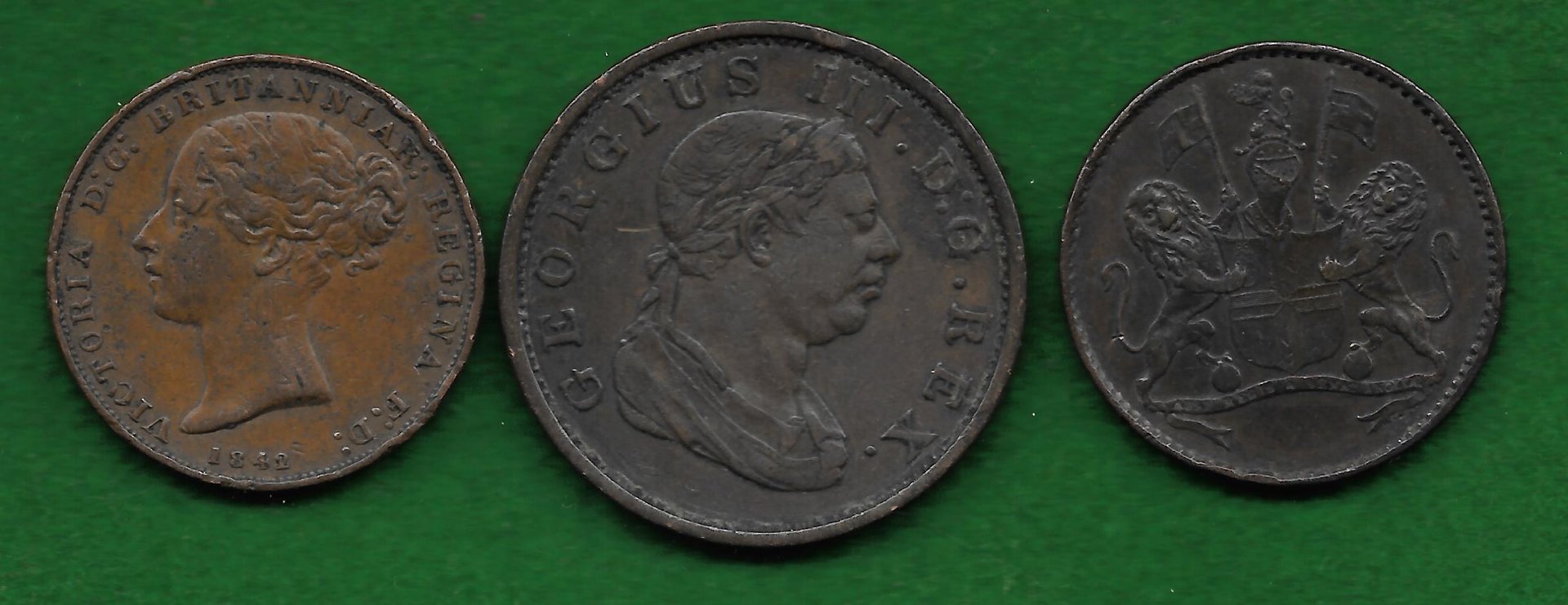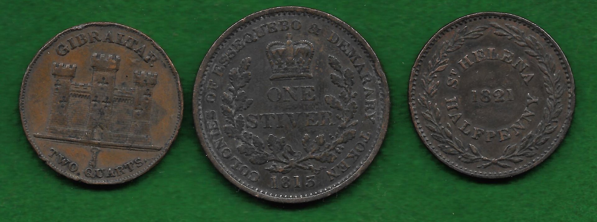 Oh how I love sorting through job lots! These three picked up yesterday - Gibraltar 2 Quarts 1842/1 Essequibo & Demerary East India Company Stiver 1813 St Helena Halfpenny 1821 All three are fairly scarce and were not issued for long. I hadn't seen any of them before in hand. I still have a load more from the same job lot to sort through too.