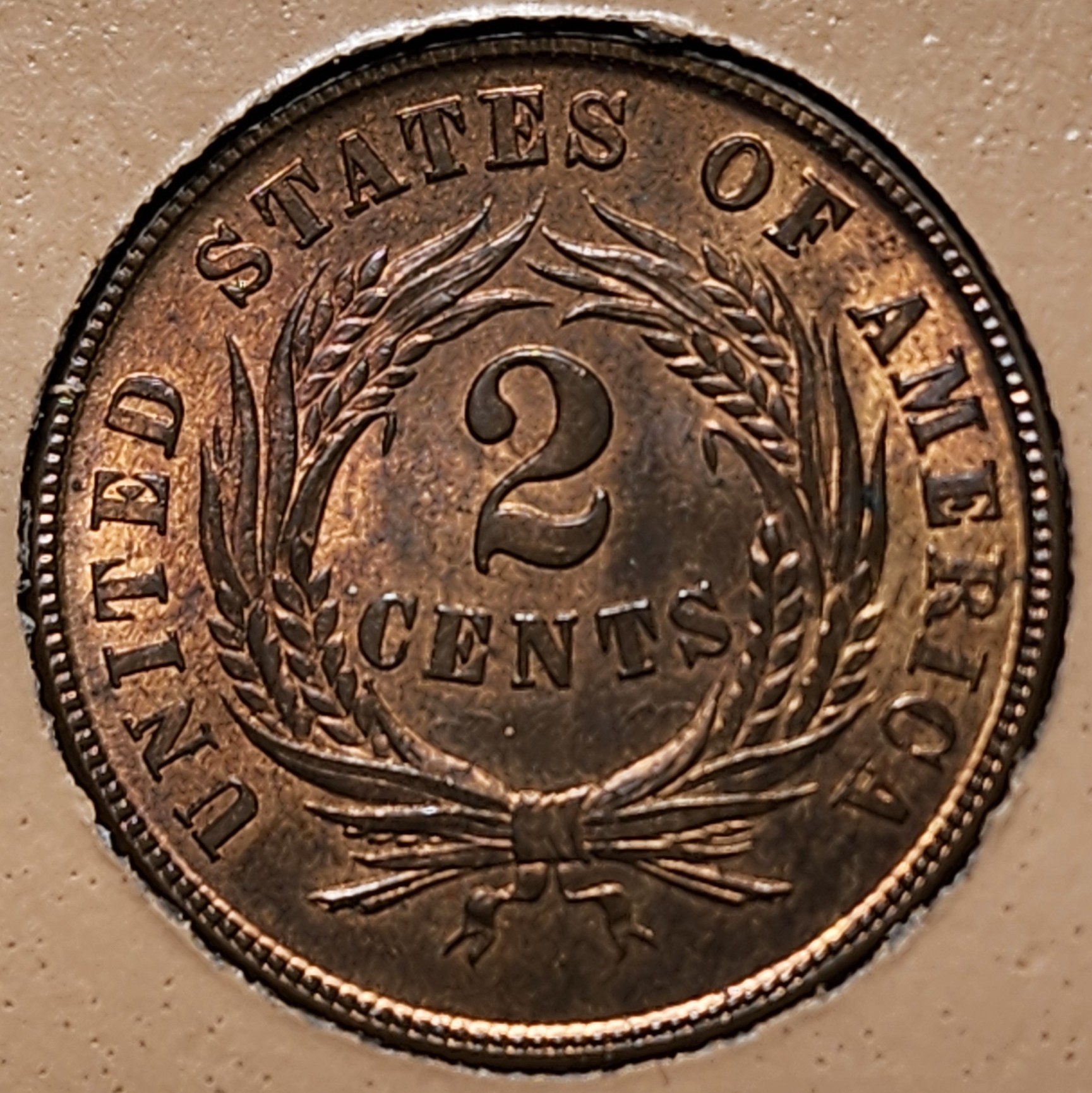 Welcome to Thursday, January 28th. We're now finished with the cents in our Virtual 7070 set, and now it is time to move on to the next denomination, which is the... 2 Cent Piece Bronze (1864-1872). As I've been doing when I lack a certain type in my current primary collection, I'll be falling back on my "holey" 19th century type set. This holed 1867 2c piece is the coin pinned to my corkboard in that collection. I periodically have lower grade 2c pieces in my giveaway inventory, but nothing amazing. The one really nice 2c piece and the best of the type that I have owned in the past (and this was many moons ago) was this 1868 proof (PCGS PR64 RD). I was of the opinion that it was a Cameo coin, but I'm pretty sure PCGS did not award the CAM designation to proof 2-cent pieces at the time it was graded. It's probably been 20 years since I sold it. All I have left are these less than ideal photos. For a while back in the early 2000s, I had an avatar picture I made from it. "66Tbird" on Collectors Universe, to whom I sold the coin, still uses that avatar to this day (though I don't believe he still owns the coin). If I could ever track that coin down, I'd love to own it again.