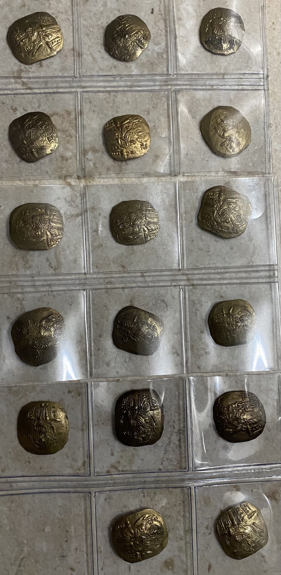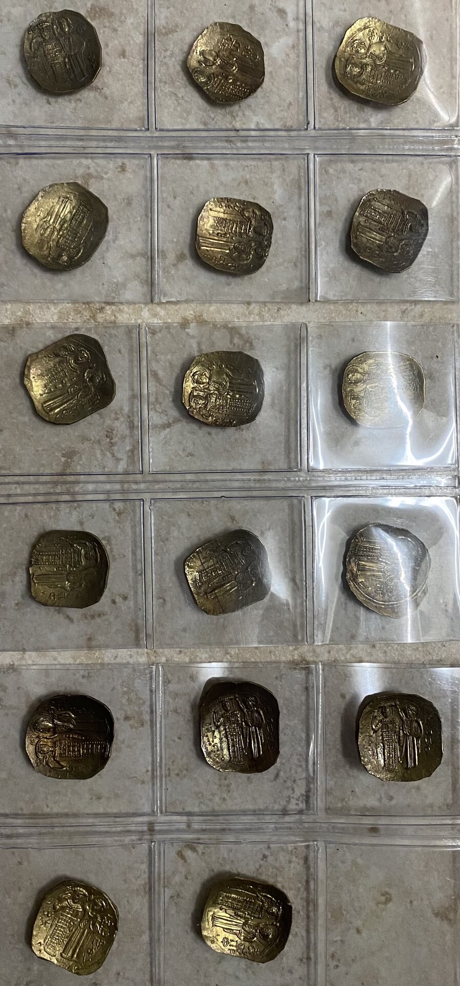 @ENGLEBERT ROY - I'm no expert, but to me most of them look like Empire of Nicaea, John III. Unsure re mint. However, one thing to note - even for de-based John III hyperpyrons and heavy clipping, 'an average' of 2g is too light. If you have coins there that are less than around 3g (or less than 2.5g at a stretch), you need to ask yourself 'why'? And clipping is not the whole answer - as you're literally talking about more than half of the coin missing. Also, how did you manage to come by so many coins and not know what era and type? P.S. - they could also be Latin Empire imitations of the Nicaean Empire hyperpyrons, which could be heavily debased (up to 50%).