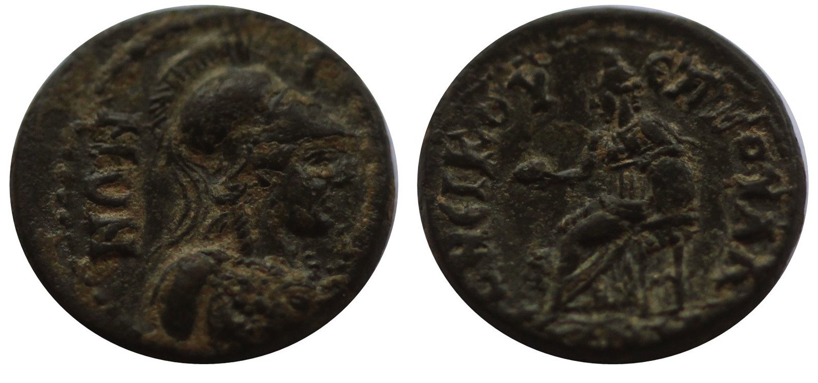 Some of my favorite Athenas: Mysia, Pergamon, 200-133 BC. Bronze Æ 15.7 mm, 3.55 g, 12 h. Obv: Head of Athena right, wearing crested helmet ornamented with star. Rev: AΘΗ-ΝΑΣ ΝΙΚΗΦΟΡΟΥ, owl standing facing on palm, with wings spread,TK monogram left and ΠΛ right. Refs: SNG Copenhagen 388 (same); c.f. SNG von Aulock 1375-6, BMC 197-199, SNG France 1920-2, SNG BN 1913-6 (various monograms). Phrygia, Apameia, ca. 88-40 BC. Greek Æ 23 mm, 7.71 g. Magistrate Philokratos son of Aristos. Obv: Bust of Athena to right, wearing aegis and crested Corinthian helmet decorated with griffin. Rev: AΠAMEΩN / ΦIΛOKPATOY APIΣΤΕOY, Eagle alighting right above Maeander pattern; to l. and r., eight-pointed star above piloi of the Dioskouroi. Refs: BMC 25.87, 105-108; SNG Cop 168-69. Macrinus and Diadumenian, AD 217-218. Roman provincial Æ Pentassarion, 12.06 g, 26.5 mm, 6 h. Moesia Inferior, Marcianopolis, Legate Pontius Furius Pontianus, June/Aug 217-Nov/Dec 217. Obv: ΑΝΤ Κ ΟΠΕΛ CΕV ΜΑΚΡΕΙΝΟC Κ Μ ΟΠΕ ΑΝΤΩΝΕΙΝΟC, Confronted heads of Macrinus right, laureate, and Diadumenian left, bare. Rev: VΠ ΠΟΝΤΙΑΝΟV ΜΑΡΚΙΑΝΟΠΟΛΙΤΩΝ, Athena wearing helmet and aegis, standing left, holding owl and inverted spear; E in right field. Refs: AMNG I 734v.; Hristova & Jekov 6.24.4.7; Varbanov 1170a; BMC 30v.; Moushmov 537; Wiczay 2148v. Faustina II, AD 147-175. Roman provincial triassarion, 7.19 g, 21.7 mm, 7 h. Thrace, Pautalia, AD 161-175. Obv: ΦΑVCΤΕΙΝΑ-CΕΒΑCΤΗ, draped bust of Faustina II, right; double band of pearls around head. Rev: ΟVΛΠΙΑC ΠΑV-ΤΑΛΙΑC, Athena seated, l., holding owl and spear; resting foot on footrest; leaning against seat, shield. Refs: RPC IV 10035, Ruzicka 108. Notes: Double die match to RPC IV 10035(1) = Ruzicka 108(2) = Paris, Bibliothèque nationale de France 957 (ex 779). Gordian III, AD 238-244, with Tranquillina. Roman provincial AE pentassarion, 11.34 gm, 29.7 mm. Anchialos, Thrace, AD 241-244. Obv: ΑVΤ Κ Μ ΑΝΤ ΓΟΡΔΙΑΝΟC ΑVΓ CΕΒ ΤΡΑΝ-ΚVΛΛΙΝΑ, confronted busts. Rev: ΟVΛΠΙΑΝWΝ ΑΡΧΙΑΛΕ-WΝ, Athena seated left, holding patera and inverted spear; shield at base of throne. Refs: AMNG II (Strack) 662; Moushmov 2937; Varbanov 752.