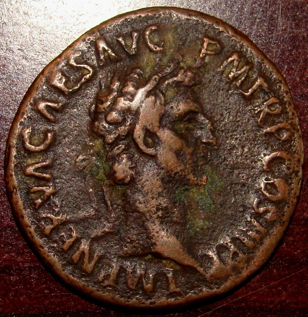 My dilemma now was to find a nice Marcus Aurelius sestertius. I searched on line for a couple of weeks but had trouble finding a nice example with legible legends that wasn't seriously overpriced. I picked this one up at my local coin club meeting last night. Our local ancient dealer is acting president, and he gave me a fair deal on this coin. This is one hefty coin and it fits nicely into my collection. I also actually like the fact that it has centering divots on the reverse, although I understand the reason for these is still the subject of considerable debate. Now I just need Nerva to complete the set.
