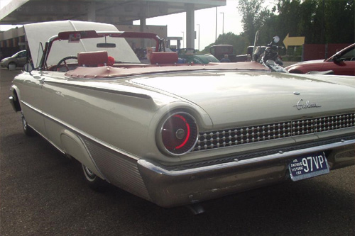 Cool Ford Galaxy 500 memory cpm! My dad bought a 1961 Ford Galaxy (not a 500). It was white with fins in the back -- the taillights looked like a round rocket exhaust (everything was rocket/space designed in the early 1960s). I can't remember if it was later or earlier that the fins got HUGE on some cars. I remember as a kid sticking my hand down in the crack in the bench seat to pull out coins (SILVER!) that would fall out of pockets.