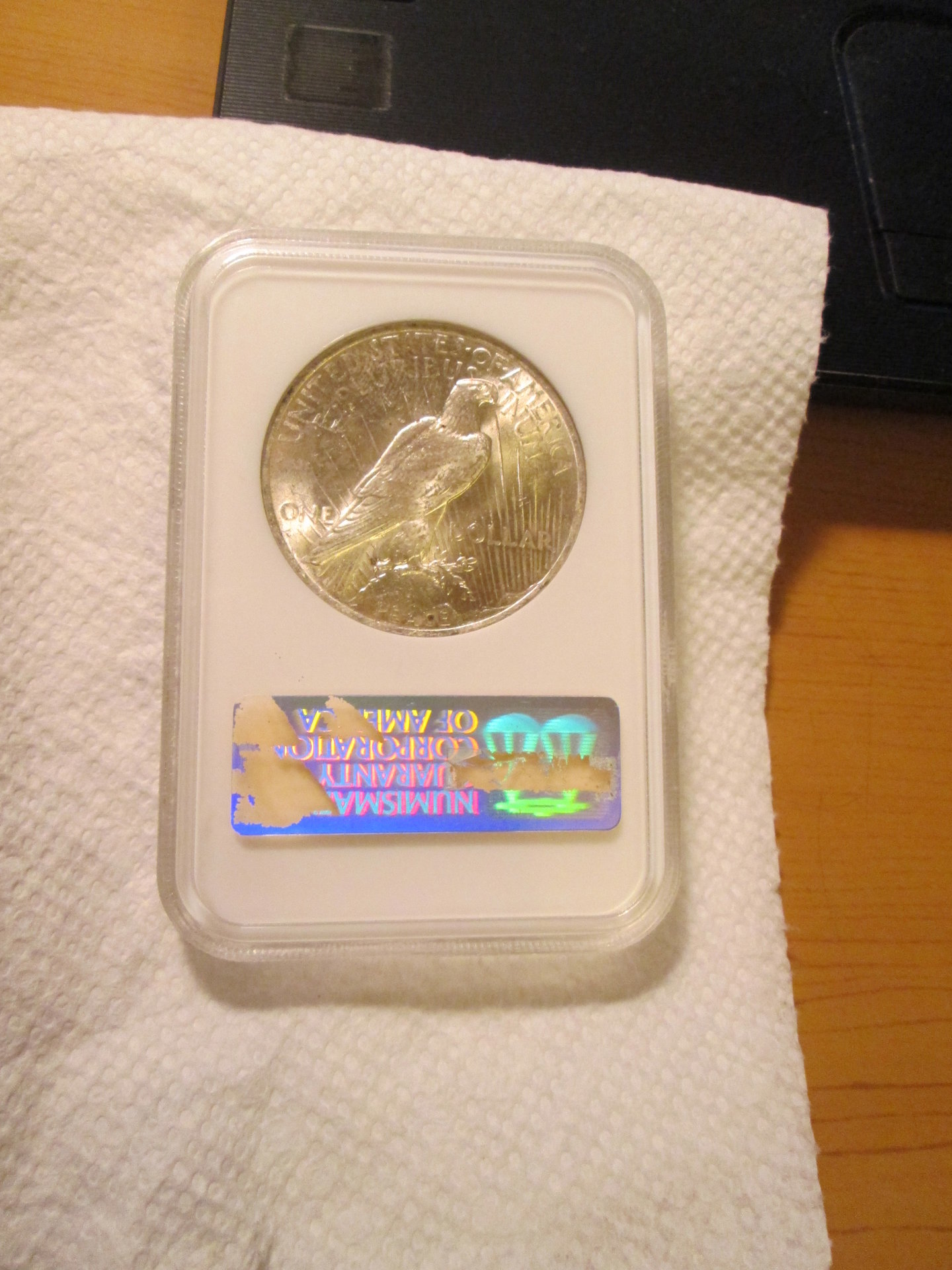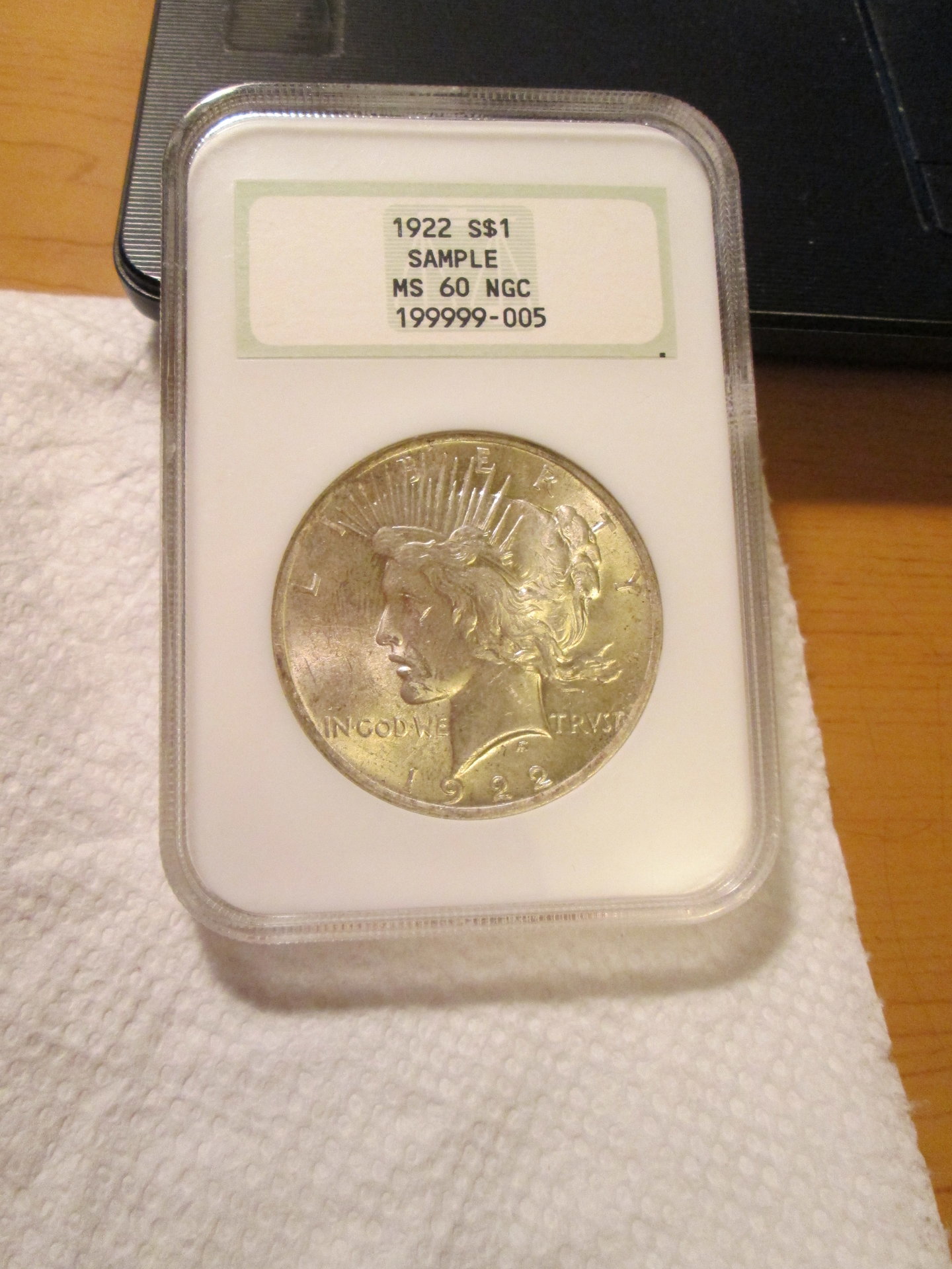 A common Peace Dollar ($20-$25 coin in raw UNC) in an NGC Sample Slab. This one sold in 2016 but these seem to have stayed in a fairly consistent price range. What did it sell for?